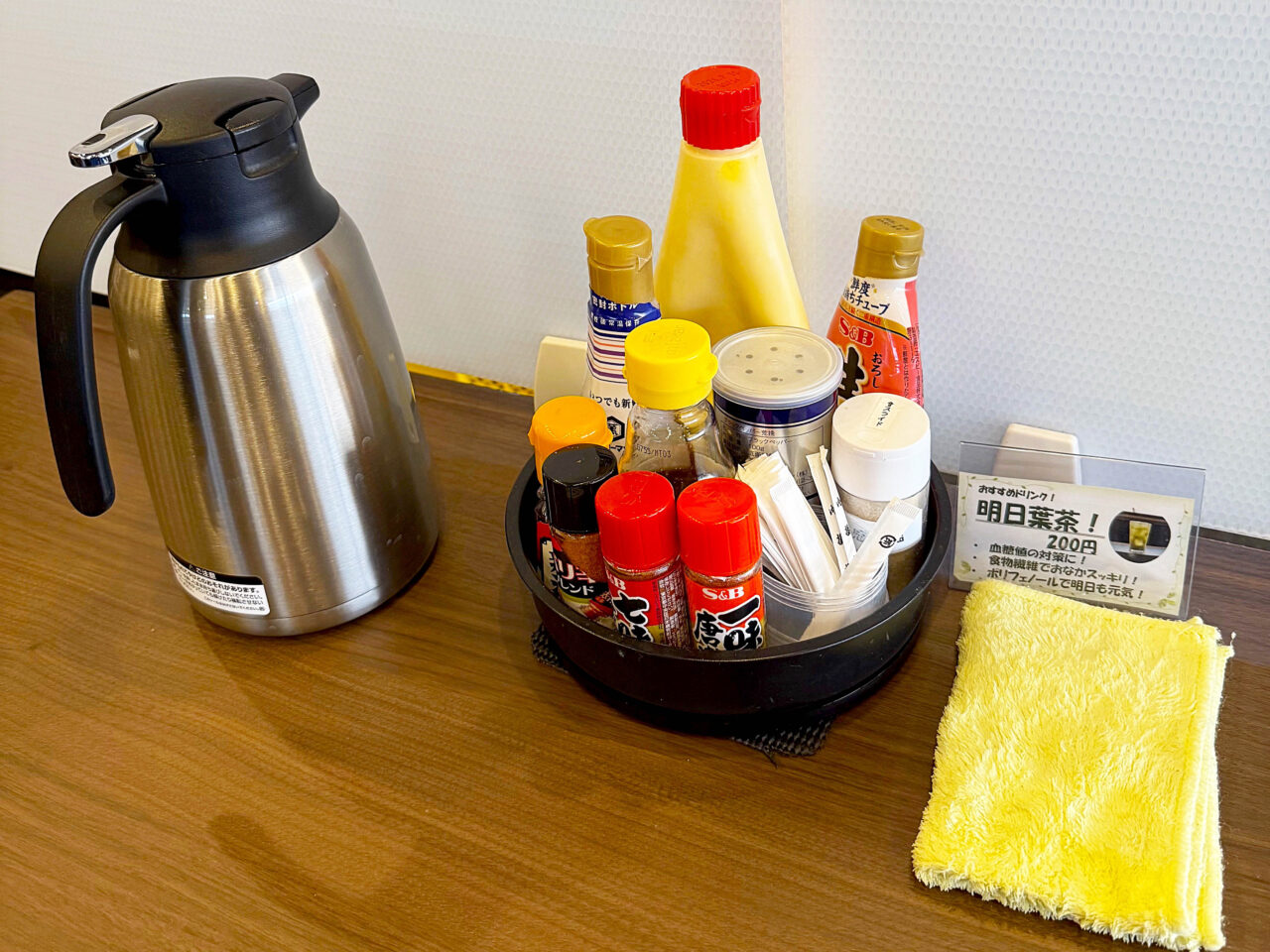 醤油・おろし生姜・マヨネーズ・ポン酢・塩・胡椒・一味・七味・ラー油・「S&Bカレープラス鮮烈バリ辛ブレンド」が有ります。