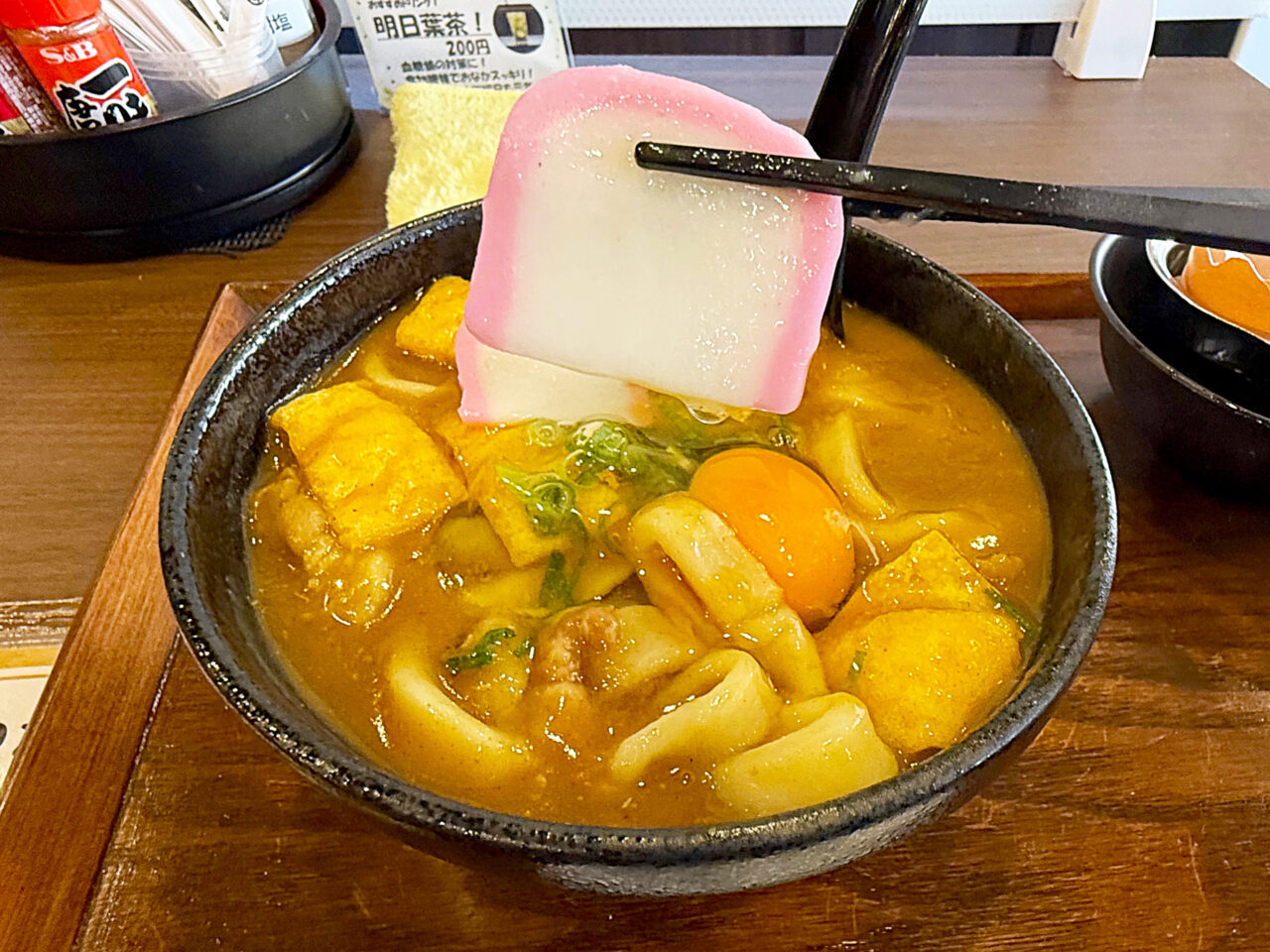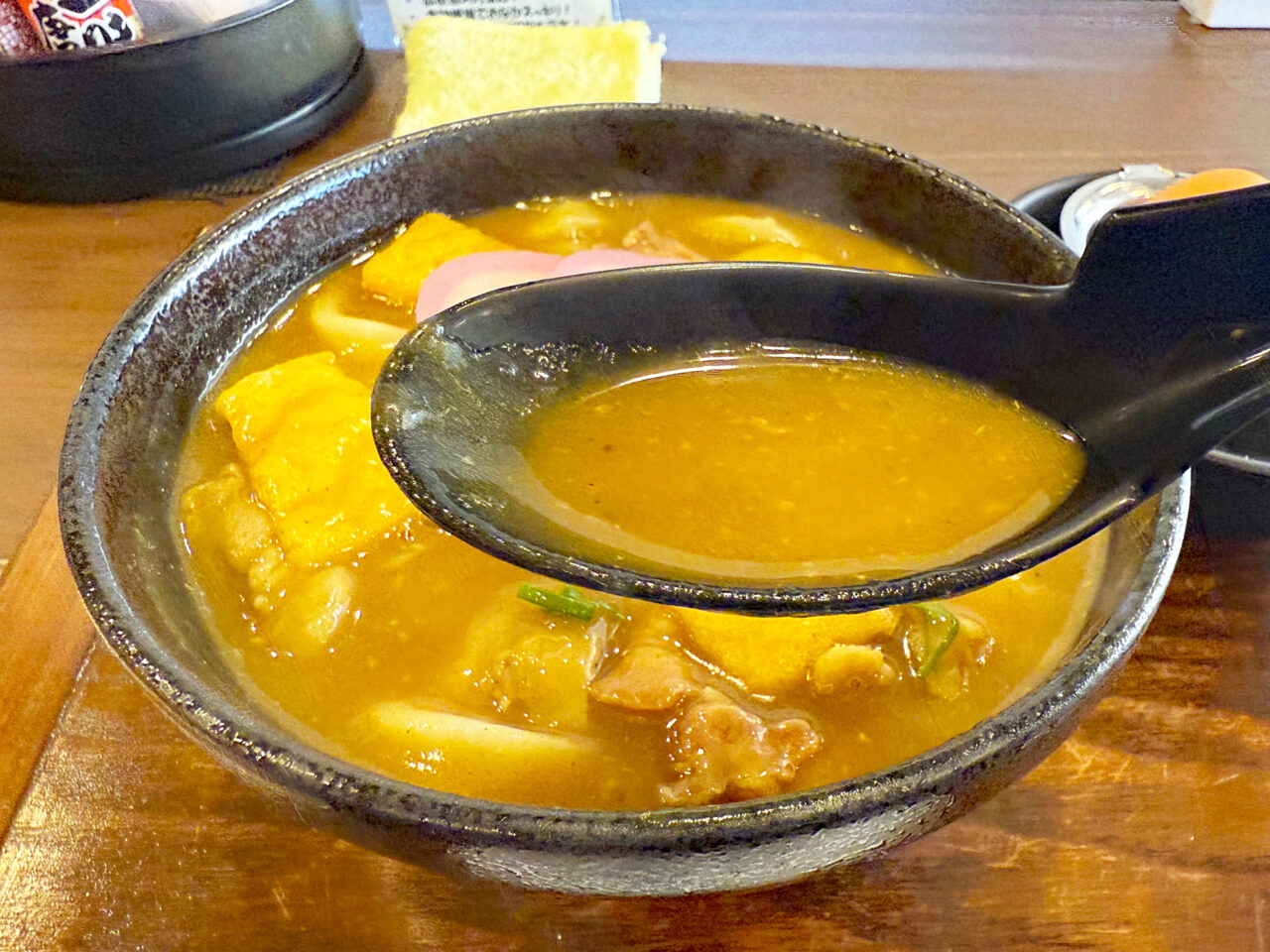 和風出汁の効いたカレースープに、お揚げとかまぼことうどんが美味しいです。