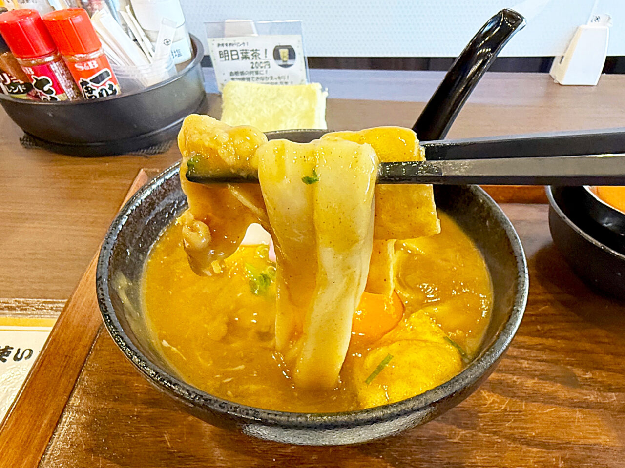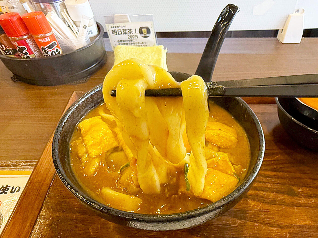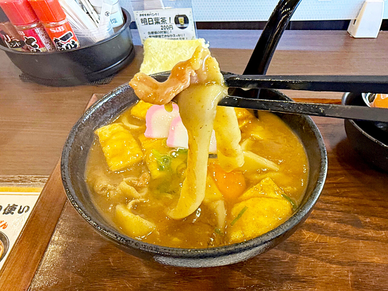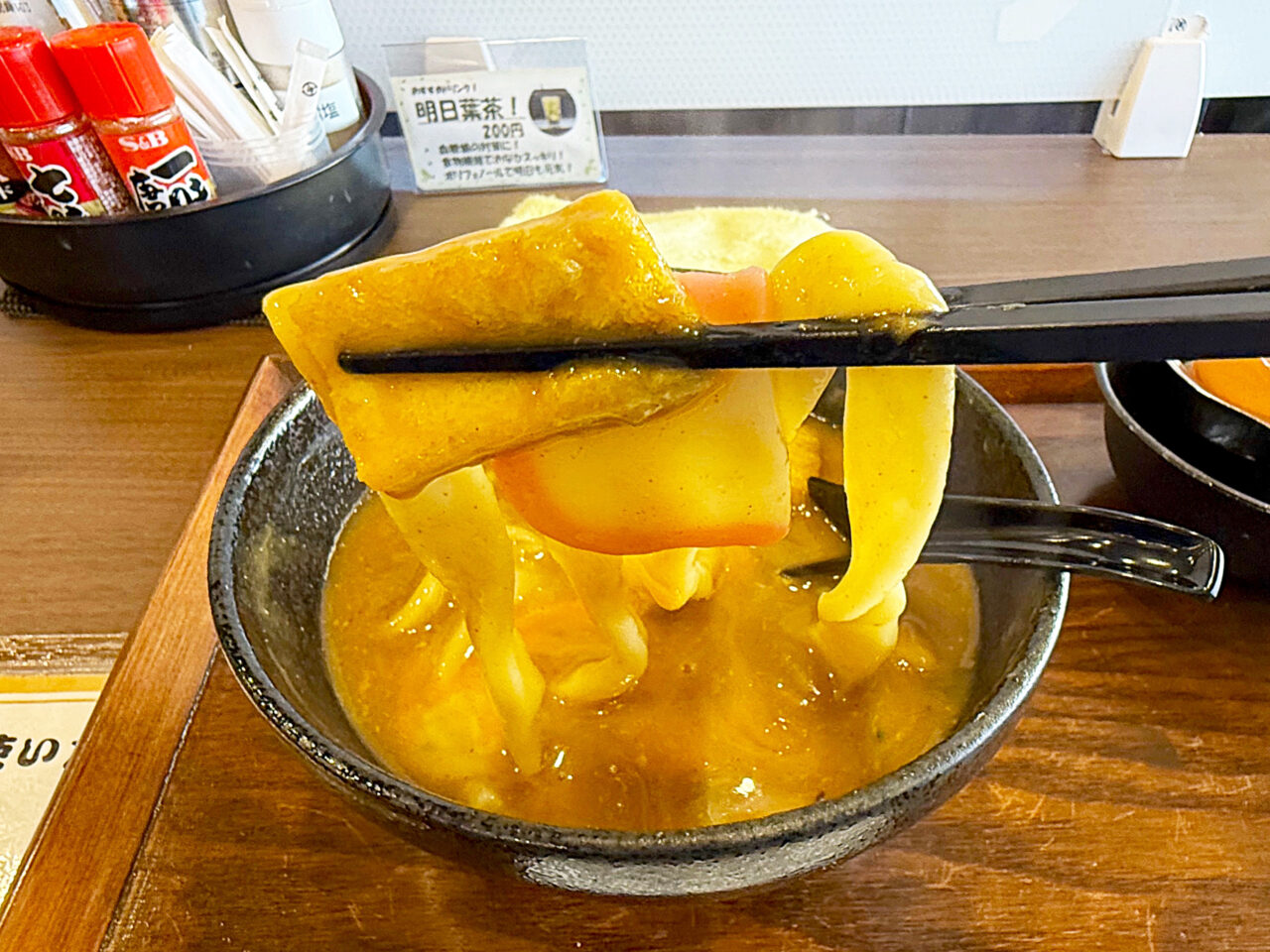 お揚げの香ばしさとカレースープにうどんが良く合います。