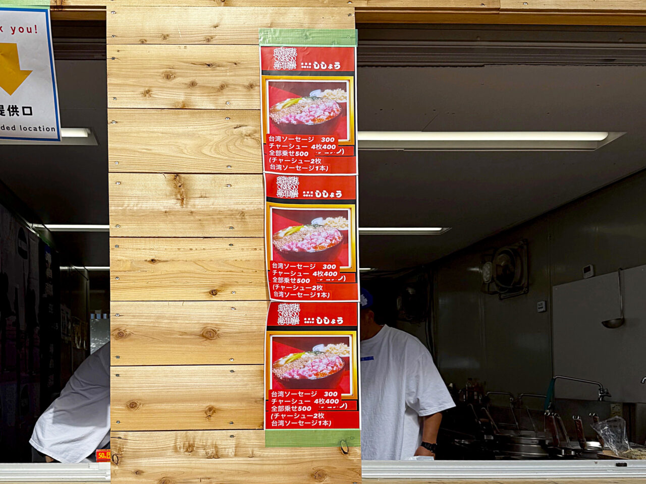 追加トッピングは、台湾ソーセージ¥300、チャーシュー4枚¥400、全部乗せ(チャーシュー2枚+台湾ソーセージ1本)¥500です。
