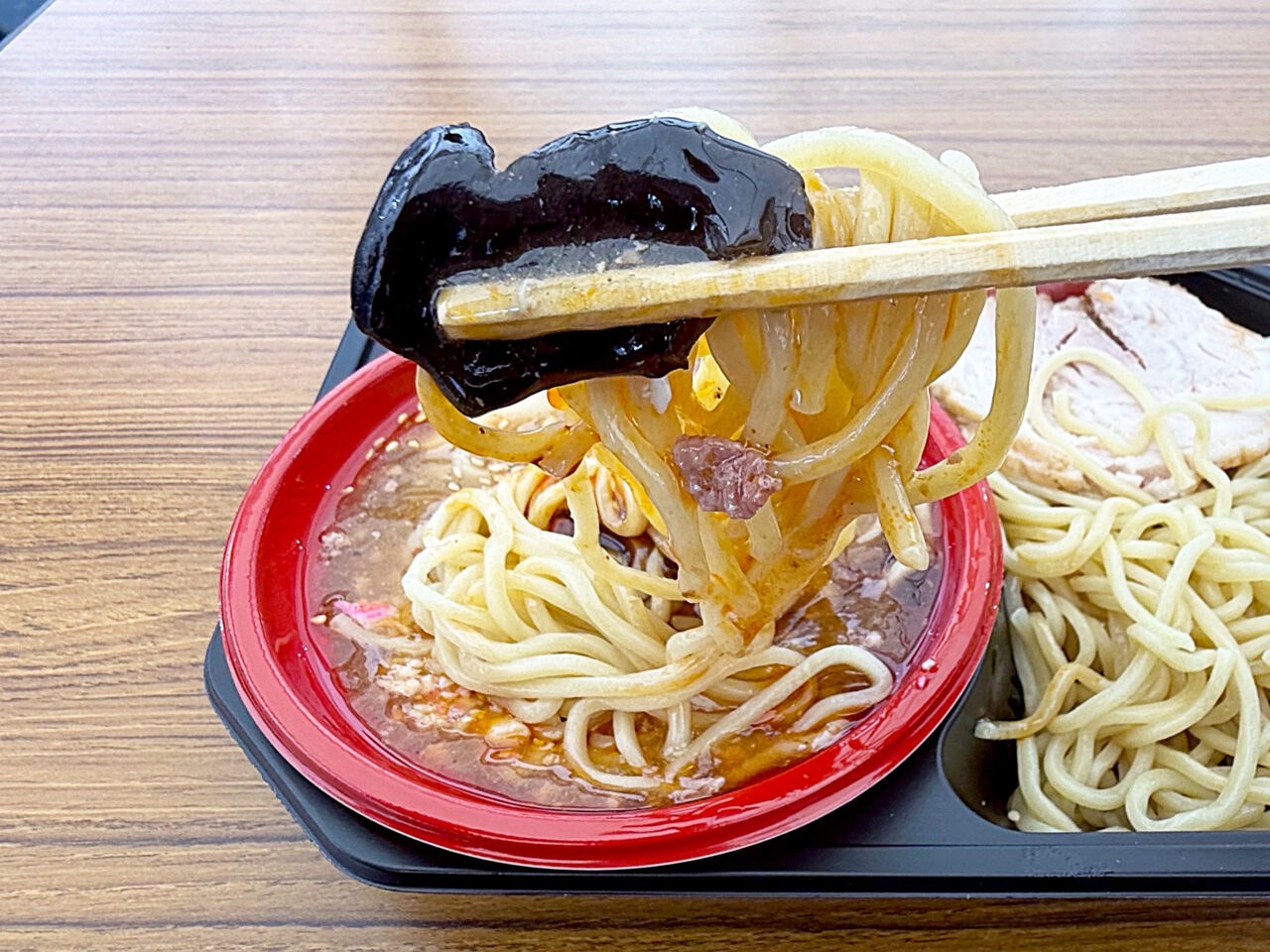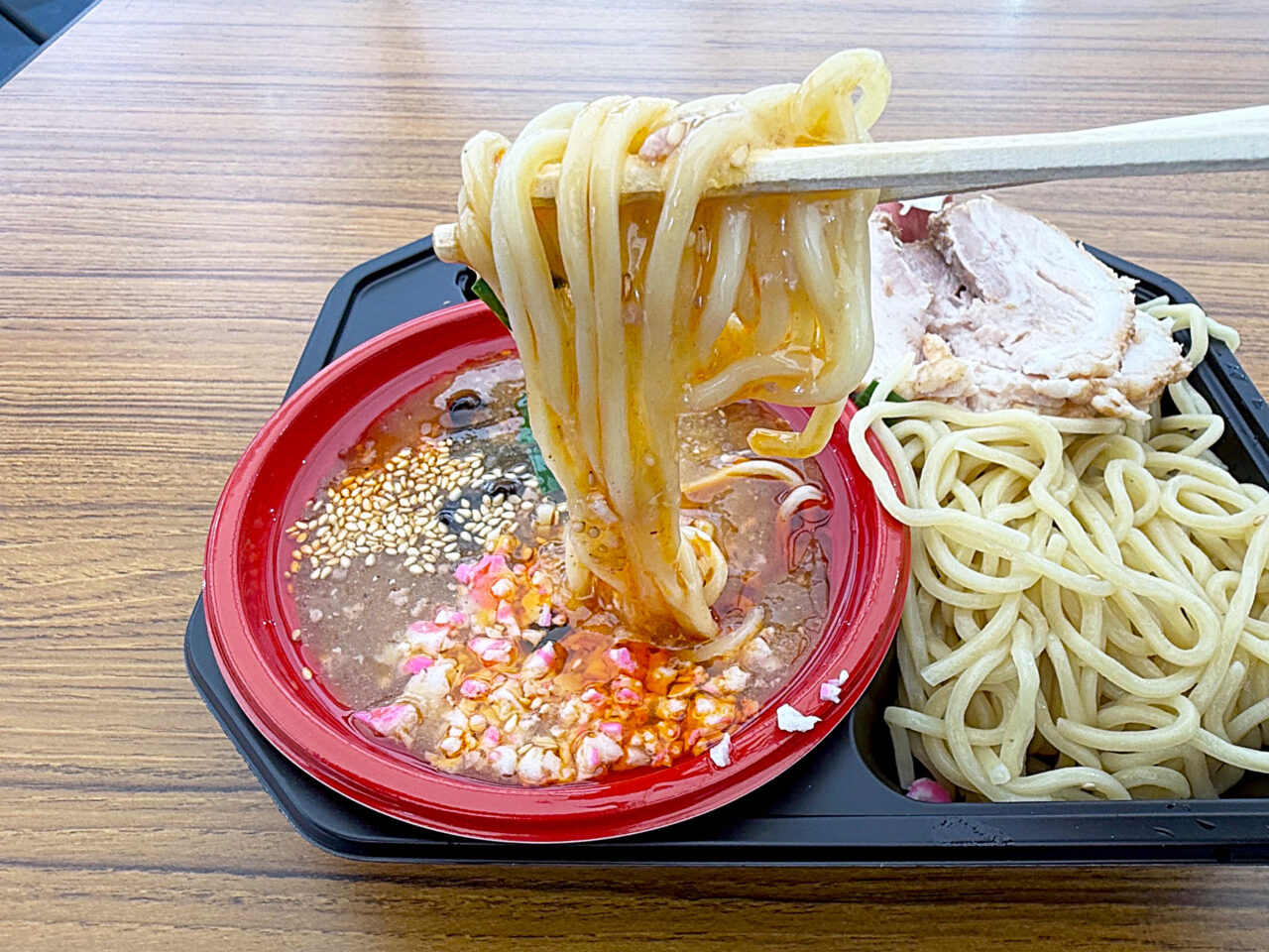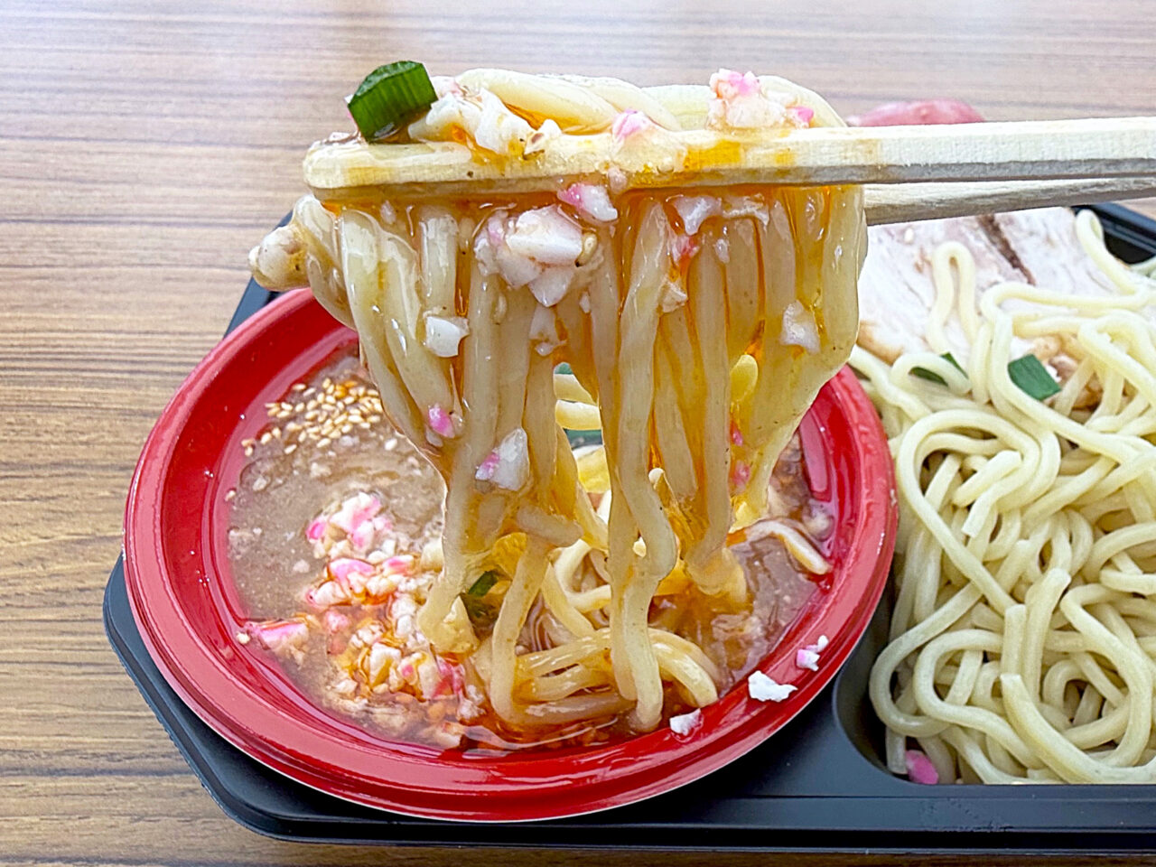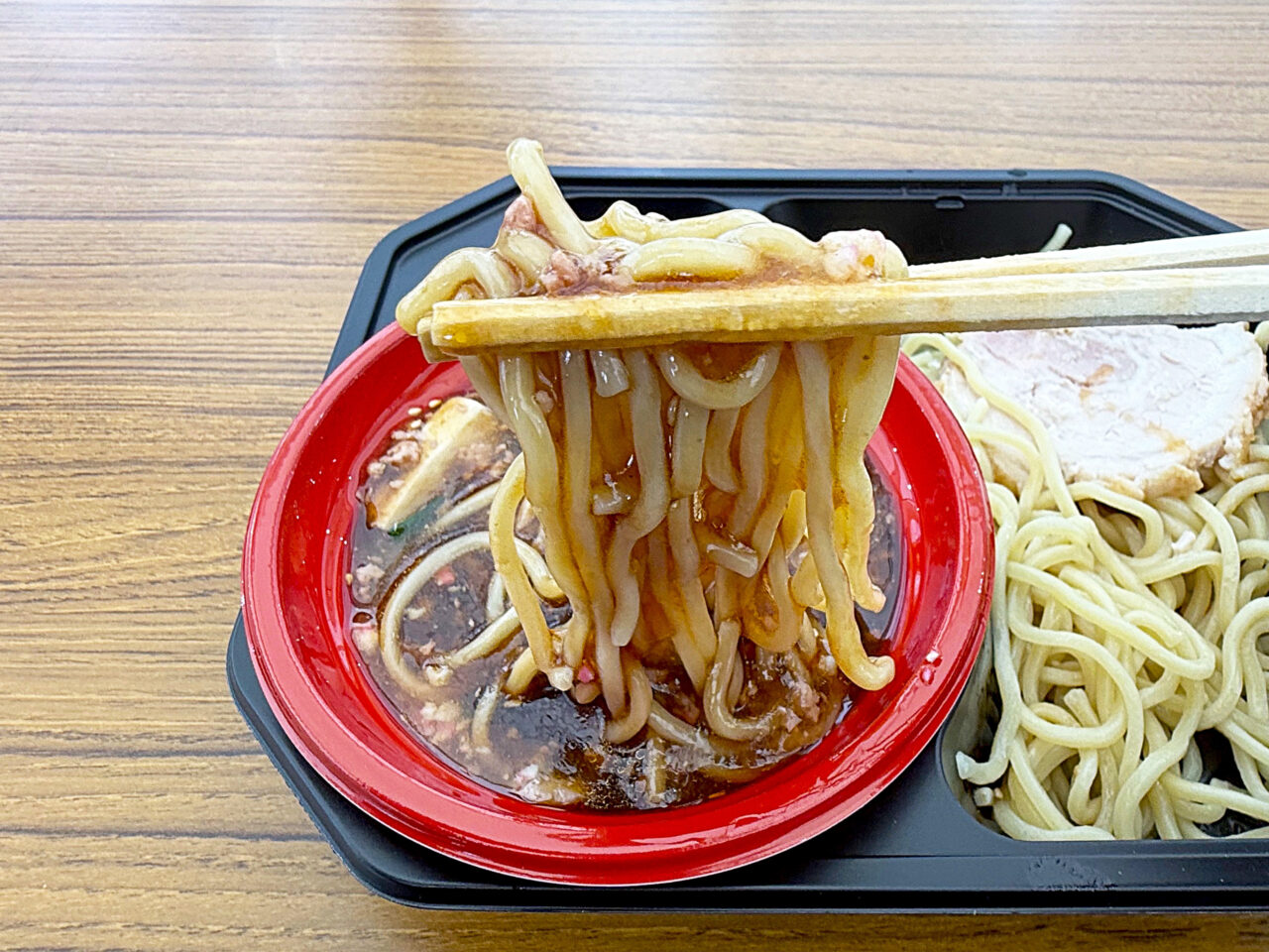 「麻超麺」の「広島風つけ麺」の様なスープと違って、今回のスープは麻婆麺っぽいスープなので、小麦感が有る麺が合いそうです。