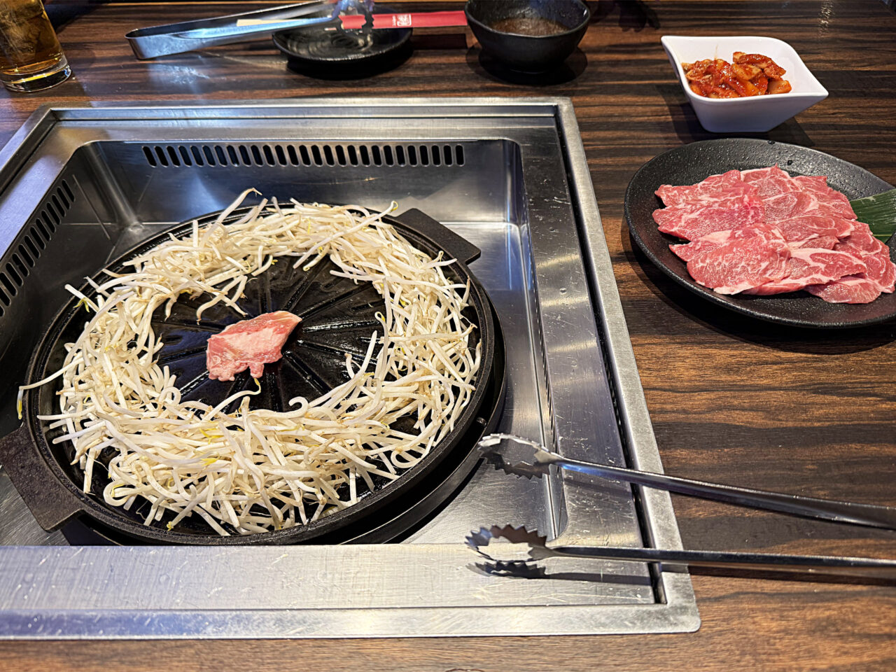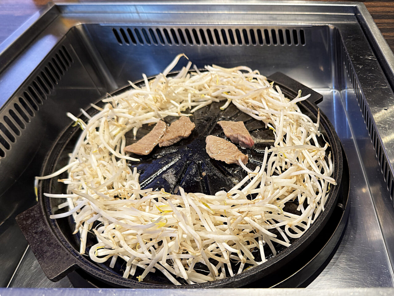 「モヤシ」を周りに並べて真ん中で「生ラム肩ロース」を焼いて行きます。