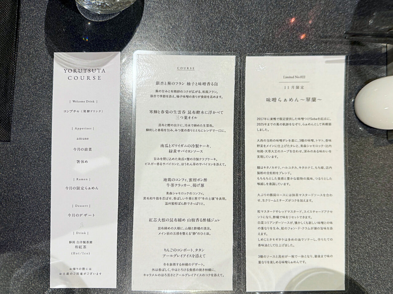 「Japanese Soba Noodles 蔦」さんの会員制「夜蔦」の、11月の限定ラーメン 「味噌らぁめん -翠蘭-」 のLimited Courseでしたが、どれも素晴らしい一品でした。