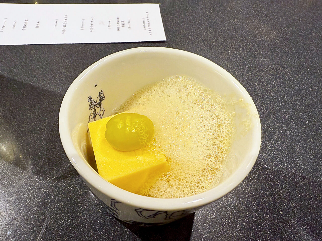 アミューズの「銀杏と無のフラン 柚子と味噌香る泡」。