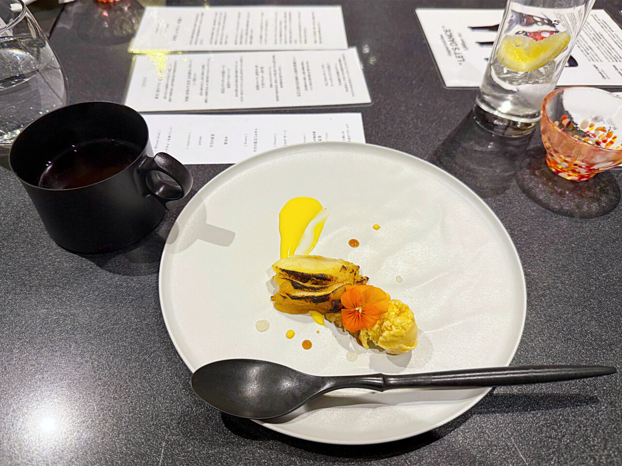 デザートは「りんごのコンポート タタン アールグレイアイスを添えて」。