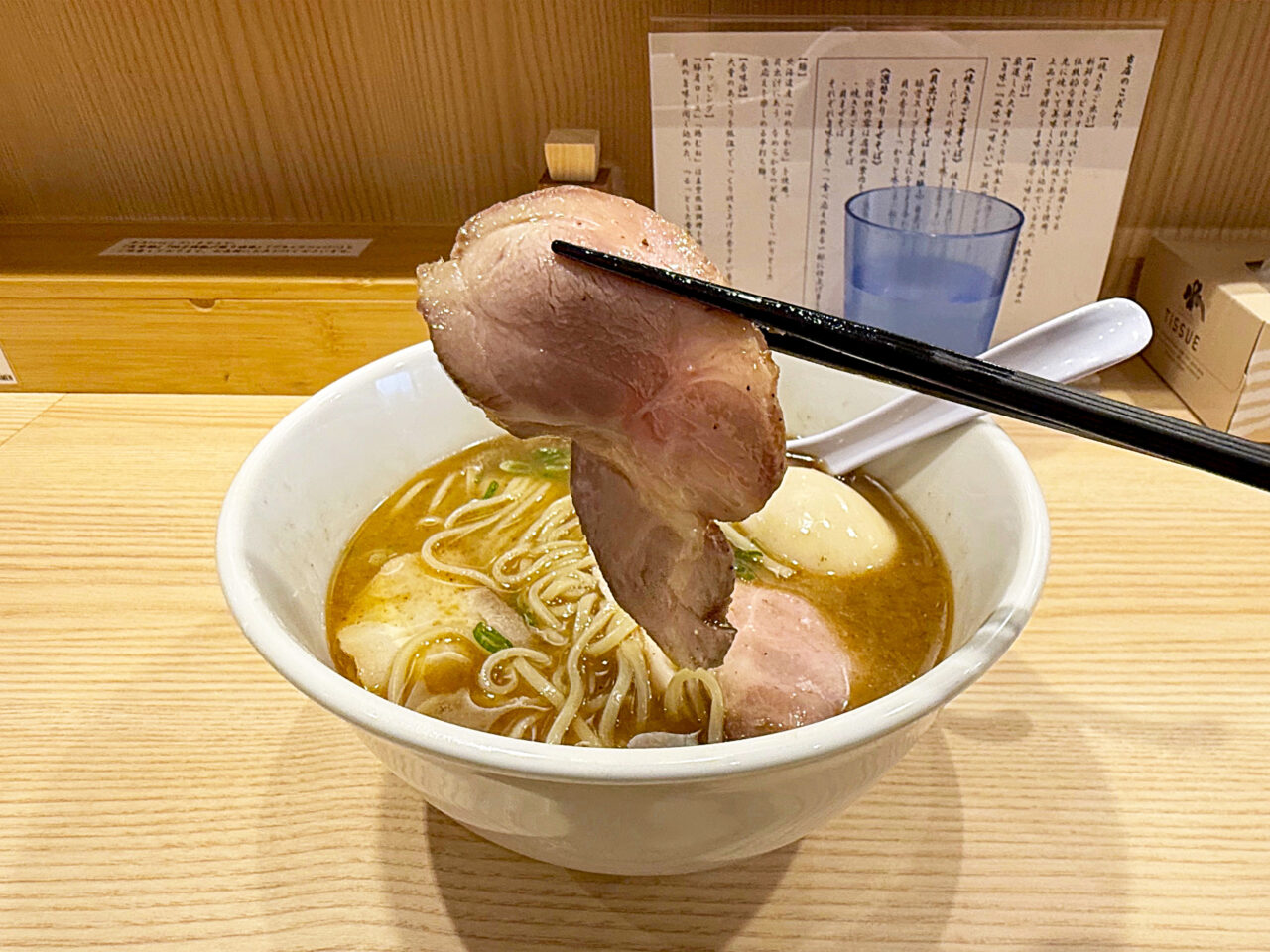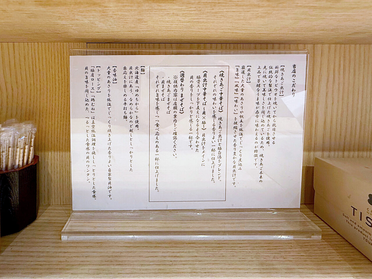 メニューも「焼きあご中華そば(焼きあご×豚)」と「貝出汁中華そば(貝×豚)」で、「中華そば くらむ」の「貝と焼きあごの中華そば(焼きあご×貝)」と「くらむの豚骨らぁ麺(豚×貝)」と似た感じです。