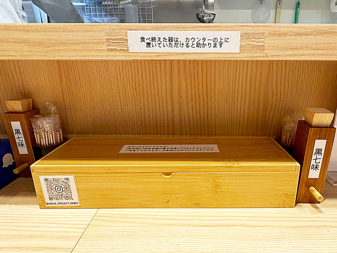 白木のカウンターに木製の箸箱と、木目調で統一されています。