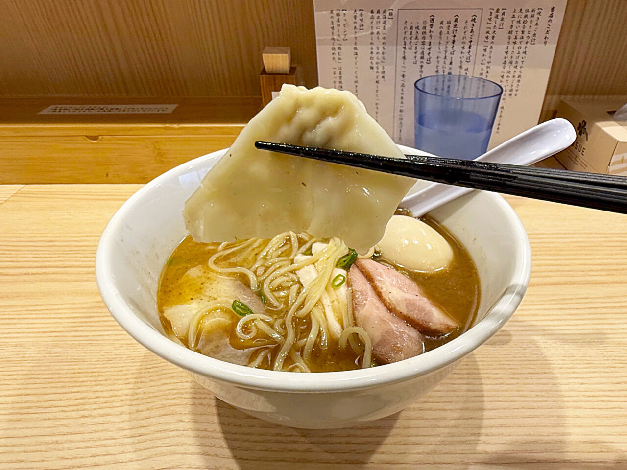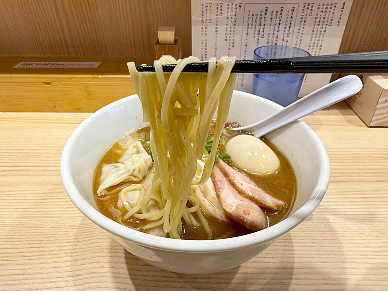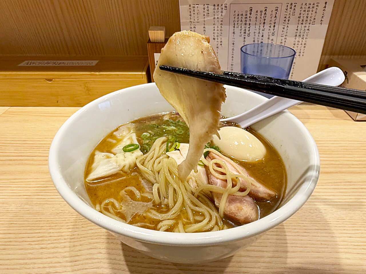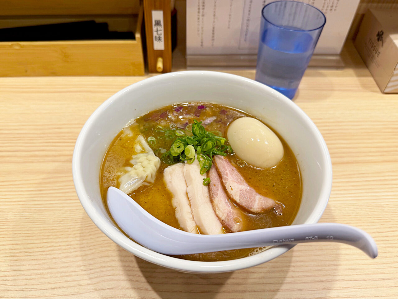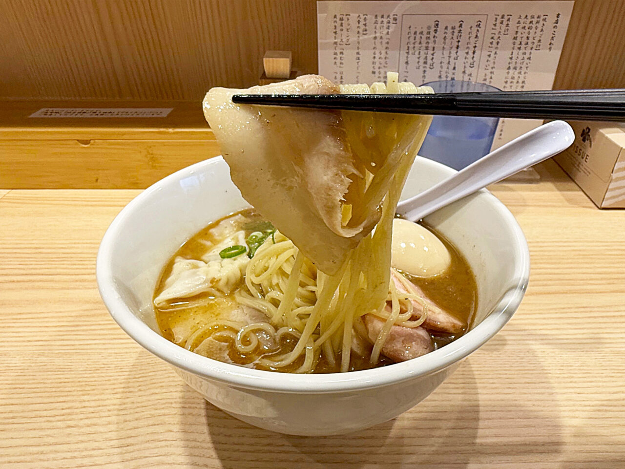 特製トッピングの豚肩ロースチャーシュー、豚バラチャーシュー、鶏胸肉チャーシュー、小ぶりのワンタン、半熟味玉などのトッピングも全てスープに合っていて素晴らしいです。