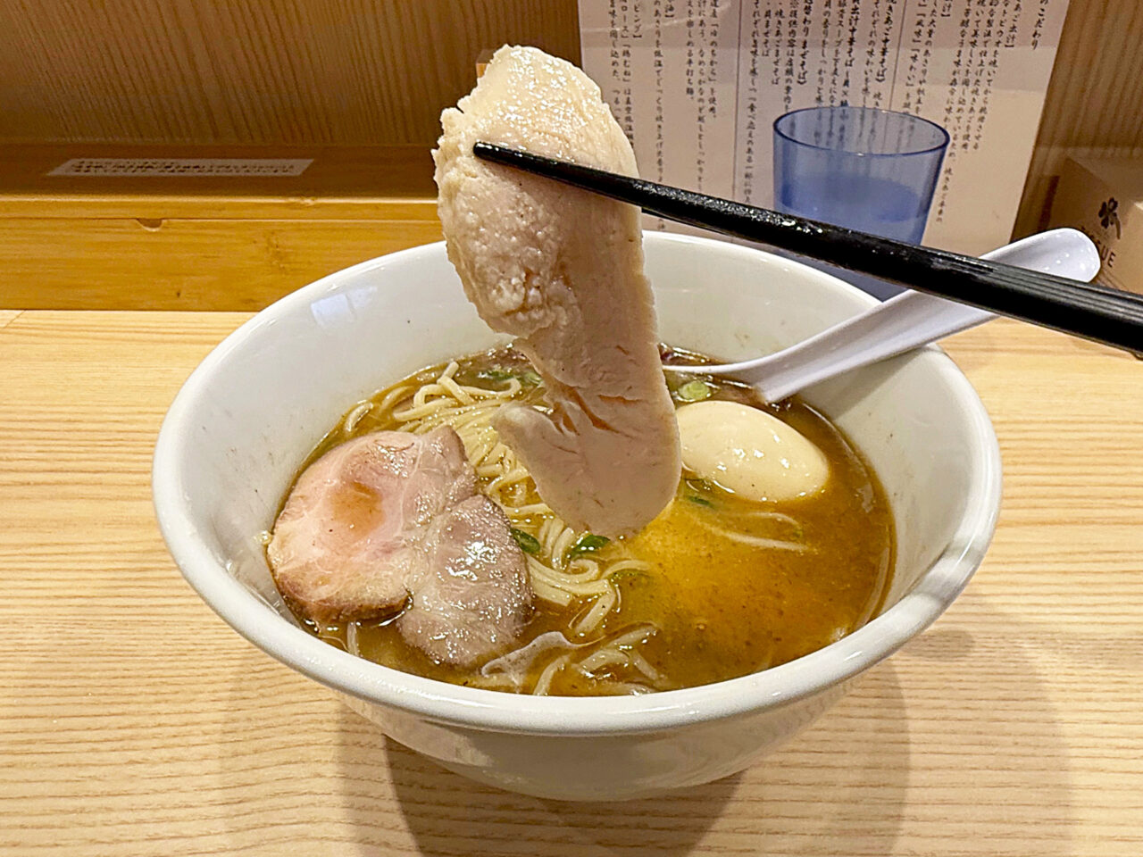 スープと麺のバランスに、鶏胸肉チャーシューが絶妙に寄り添っている感じです。