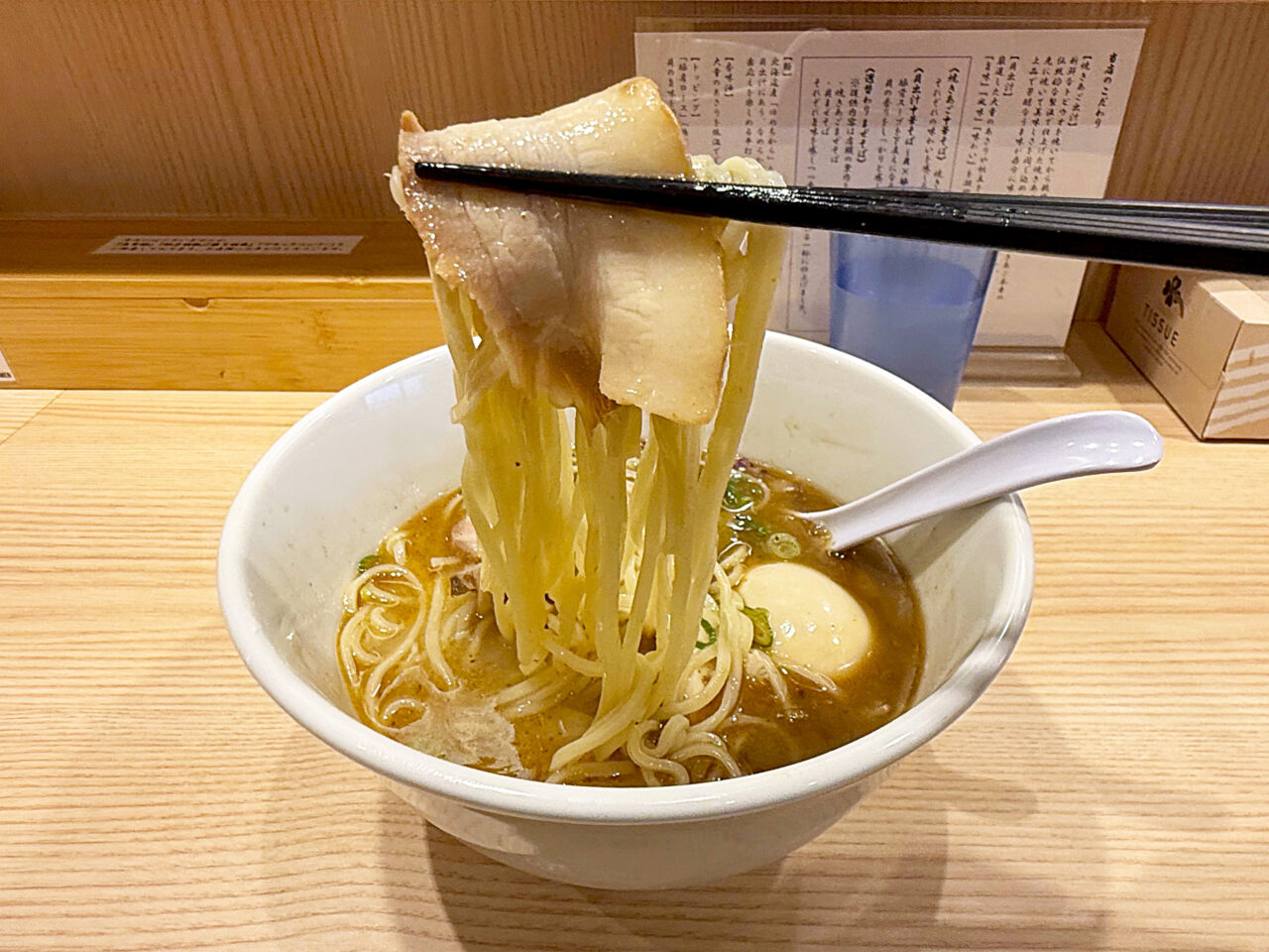 しっとり食感の鶏チャーシューとツルモチ食感の麺との相性がとても良いです。