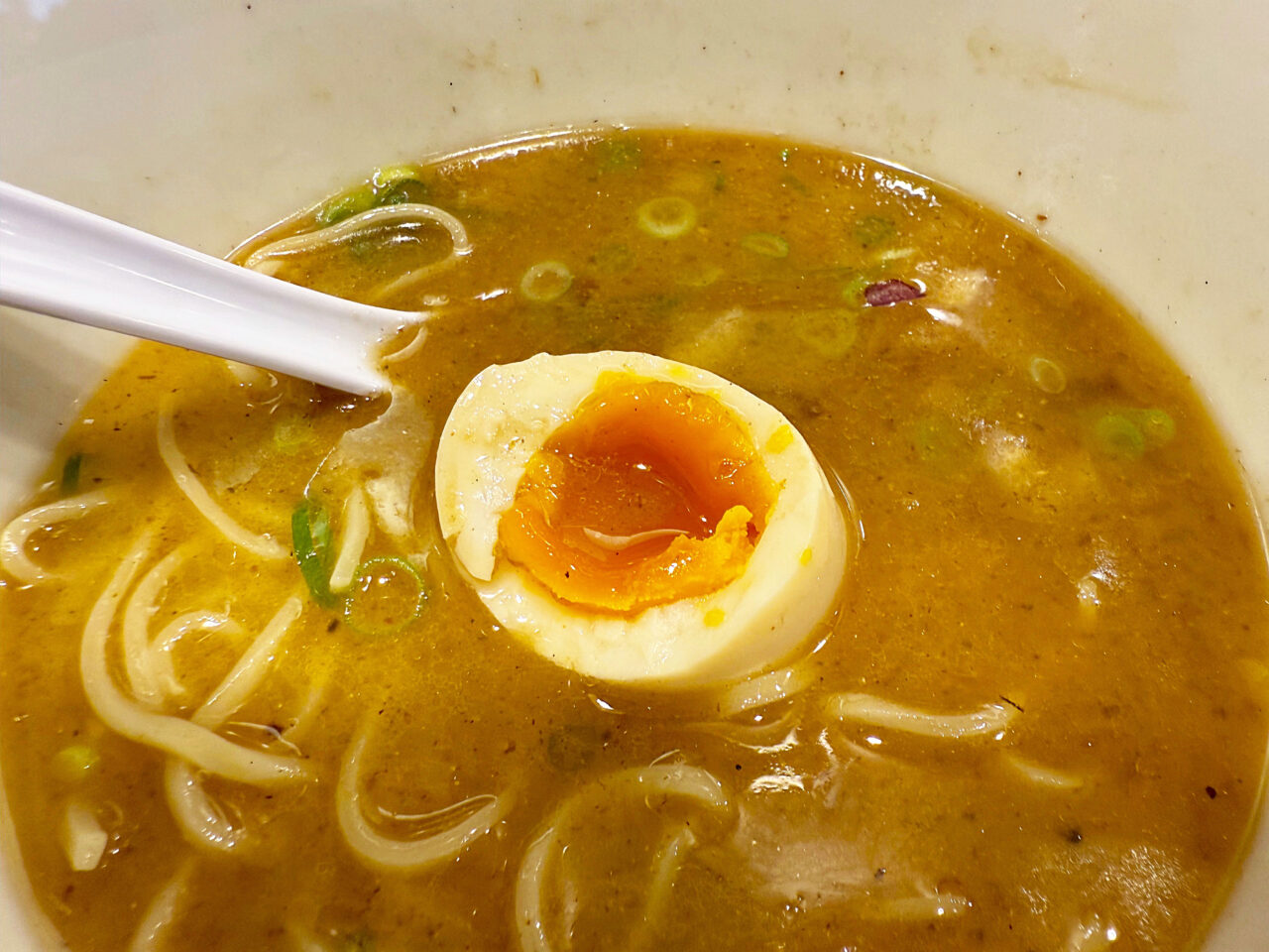 掬ってみると、ベースの豚骨スープの白い色が見えます。