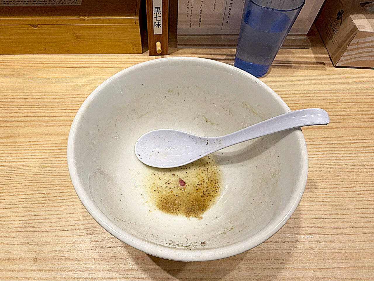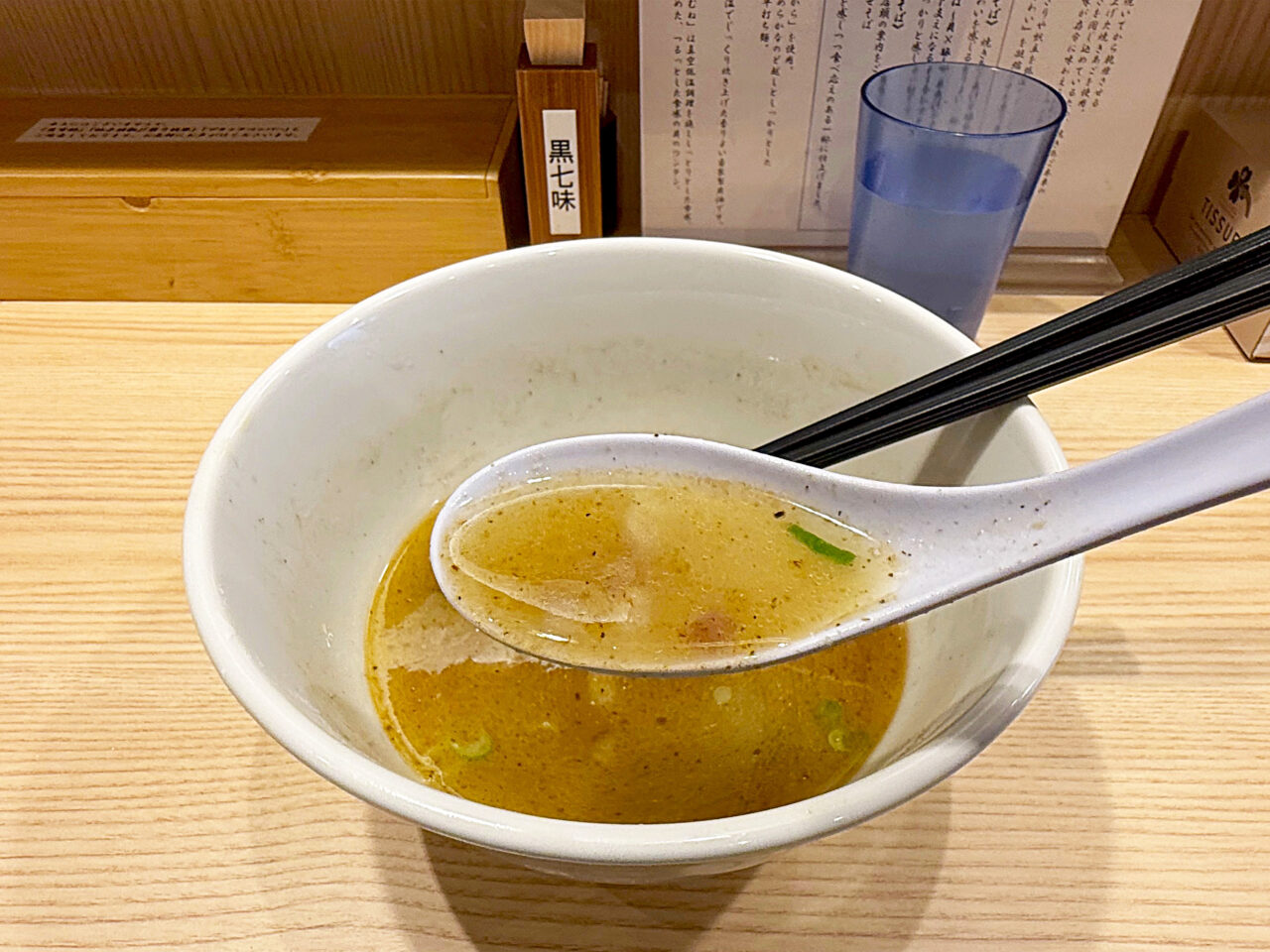 麺と具を食べ終えて、スープを味わいます。