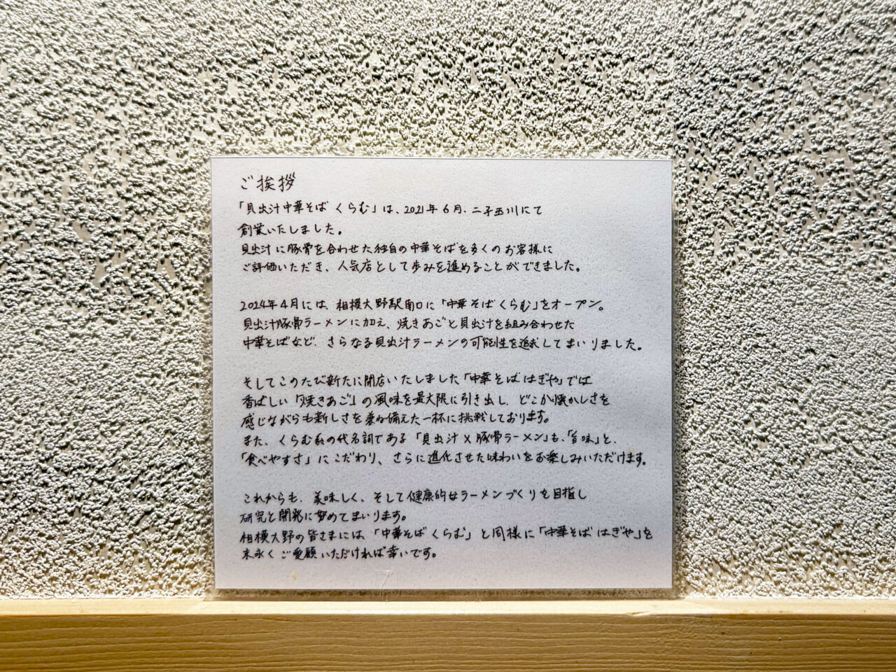 カウンターの上に、「ご挨拶」が貼ってあります。