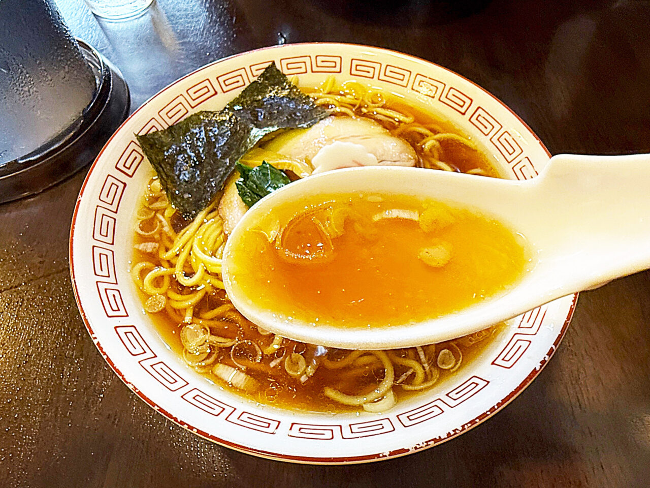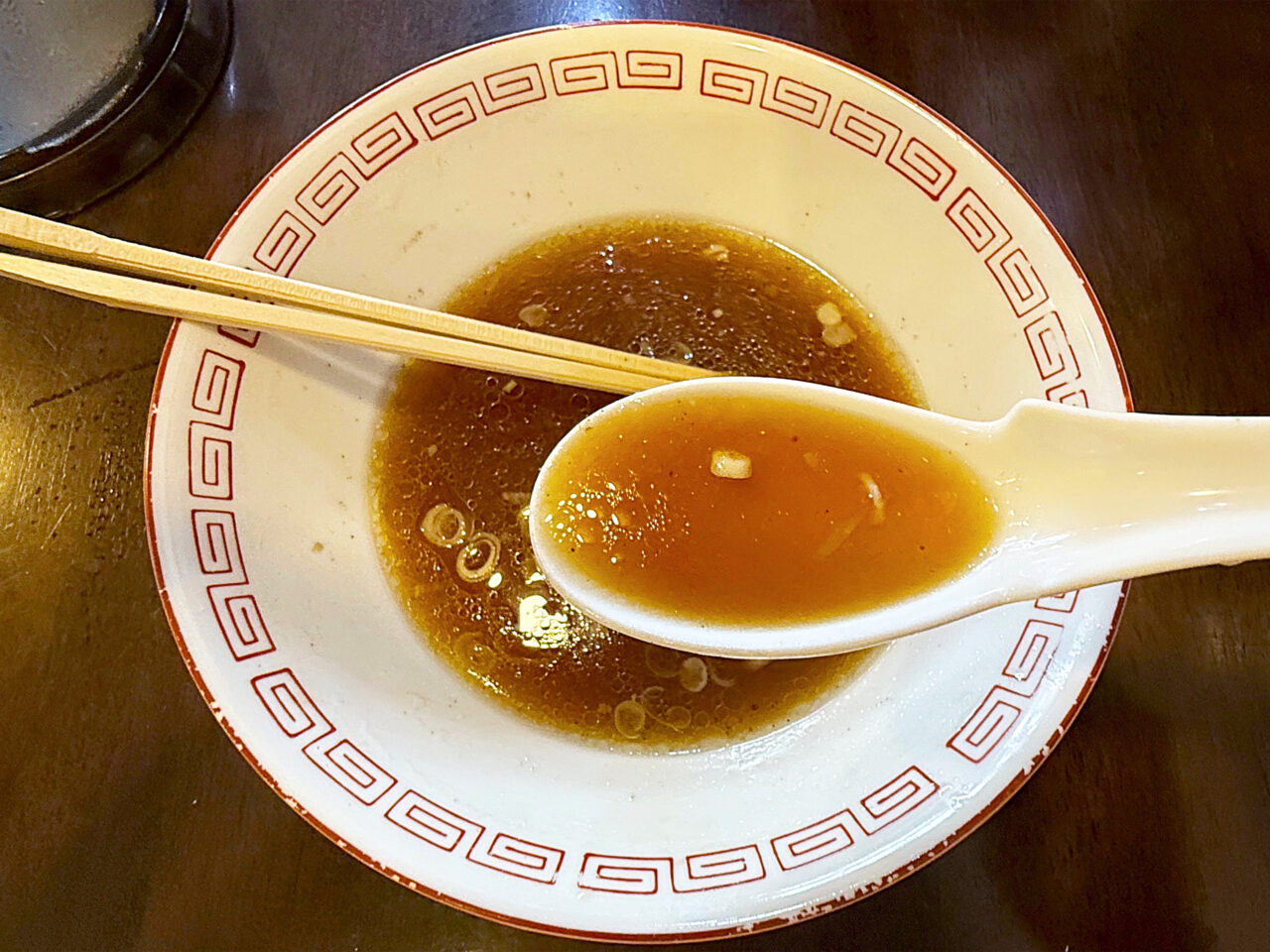 麺と具を食べ終えて、スープを味わいます。