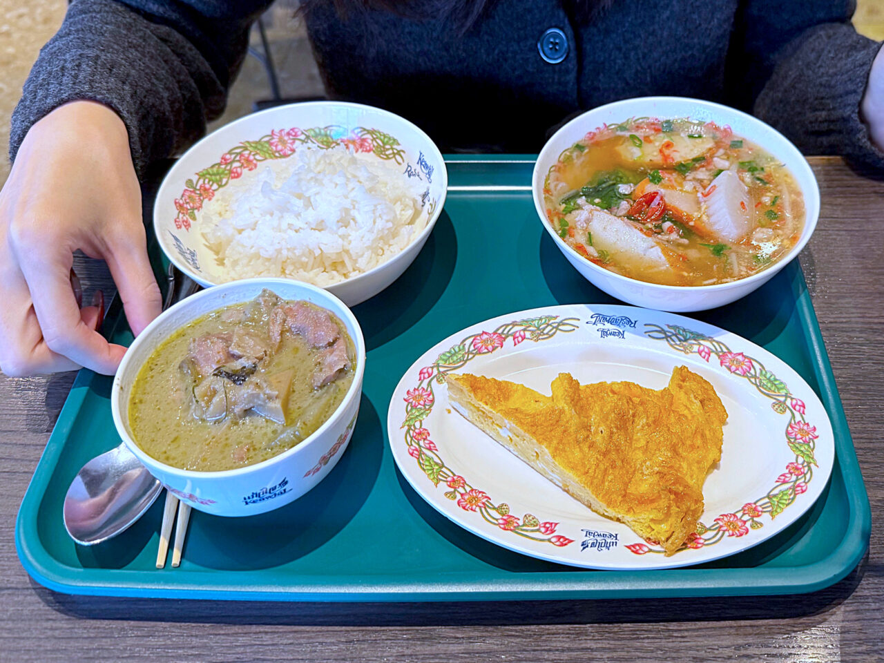 KAENG KHEAW KAI(鶏肉のグリーンカレー)、KAIJIAO MOO SUP(タイ式オムレツ)、MINI LEK TOMYAM MOO(豚肉入りトムヤムビーフン[小])とライスです。