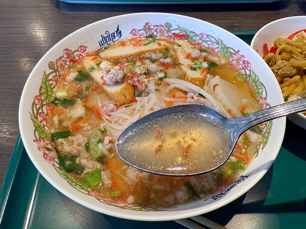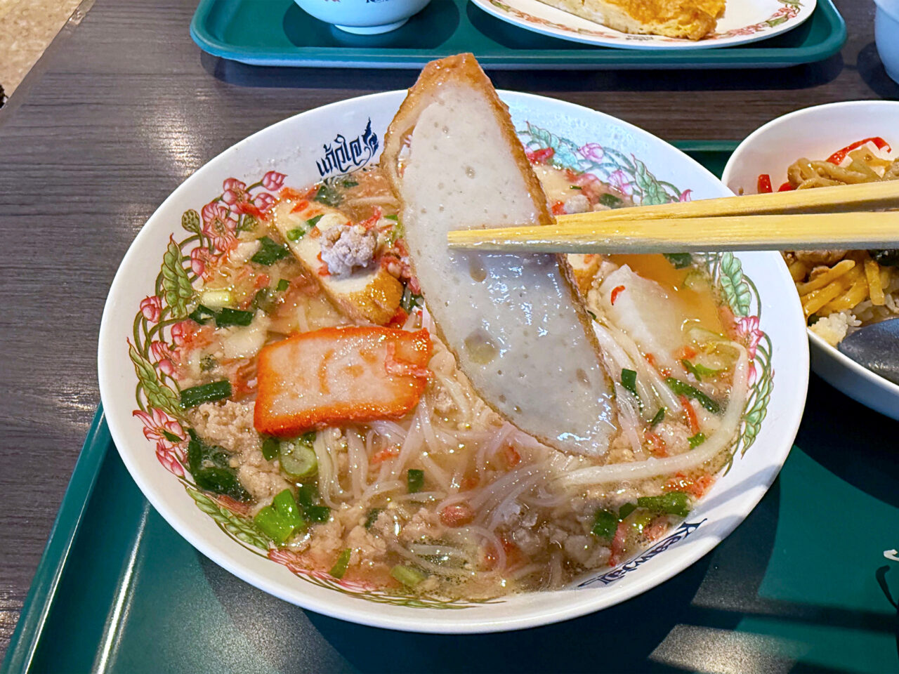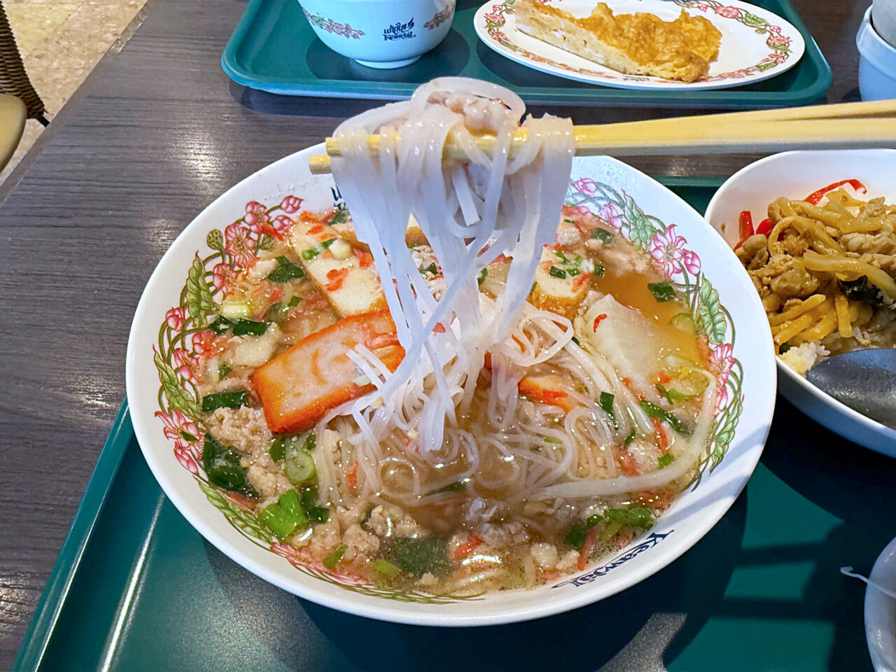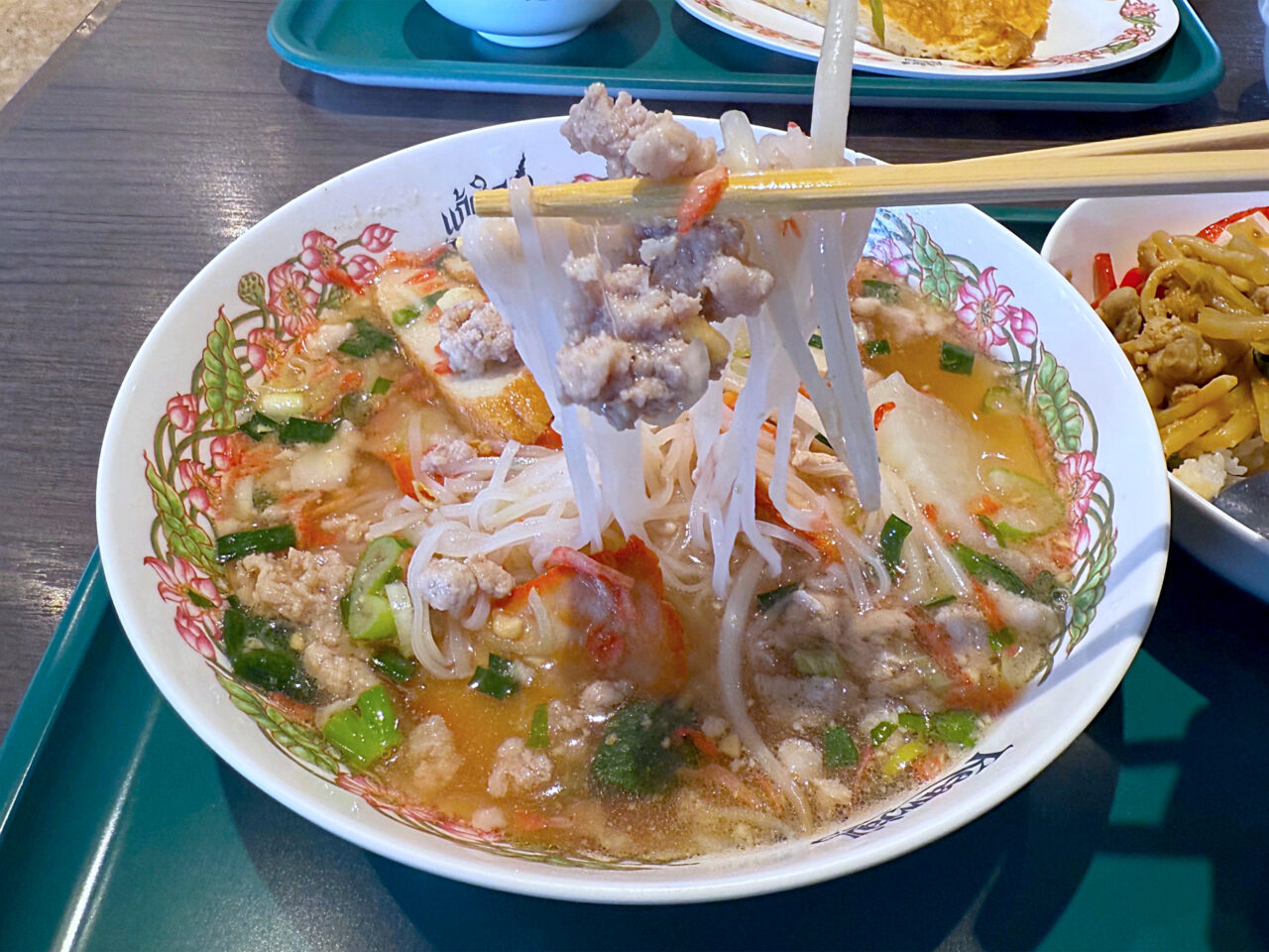 細いビーフンにスープがたっぷり絡むので、ラーメンと言うよりスープに近い感じです。