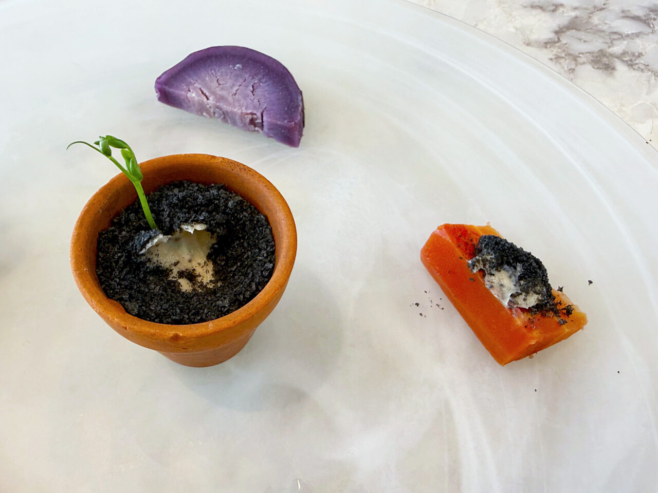真ん中の小さな植木鉢はクリームチーズのソースと竹炭で色付けしたパン粉が載っています。