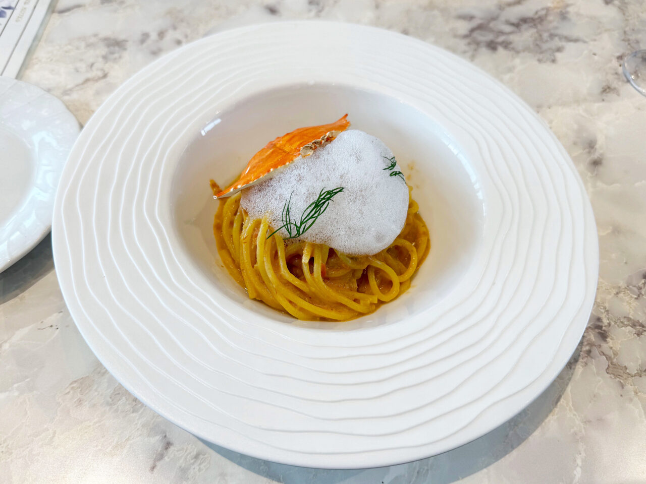 蟹の甲羅にエスプーマがまるで蟹の泡の様に盛り付けられています。