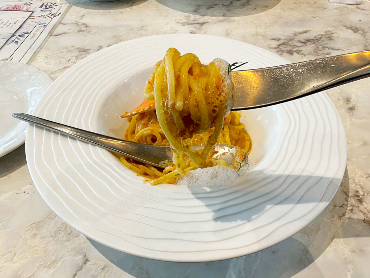 渡り蟹と紅ずわい2種の蟹のトマトクリームと、モッチリ食感の太麺が美味しいです。