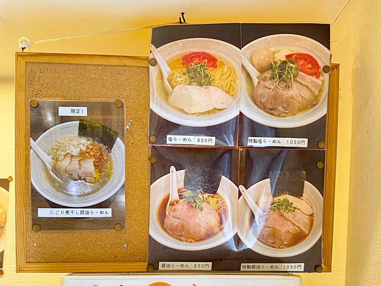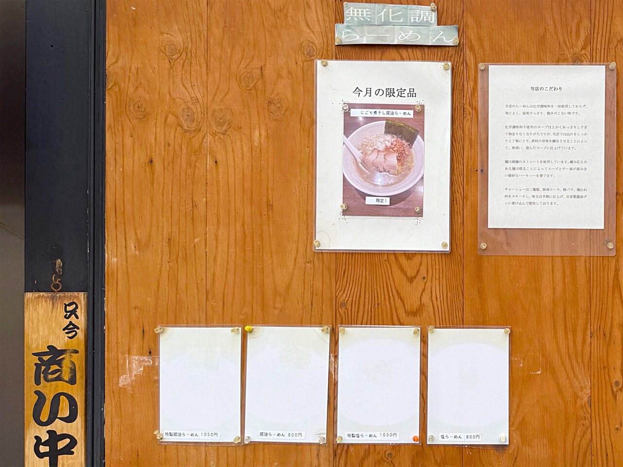 店舗外の入口横の掲示板に「今月の限定品」として「にごり煮干し醤油らーめん」が有ります。