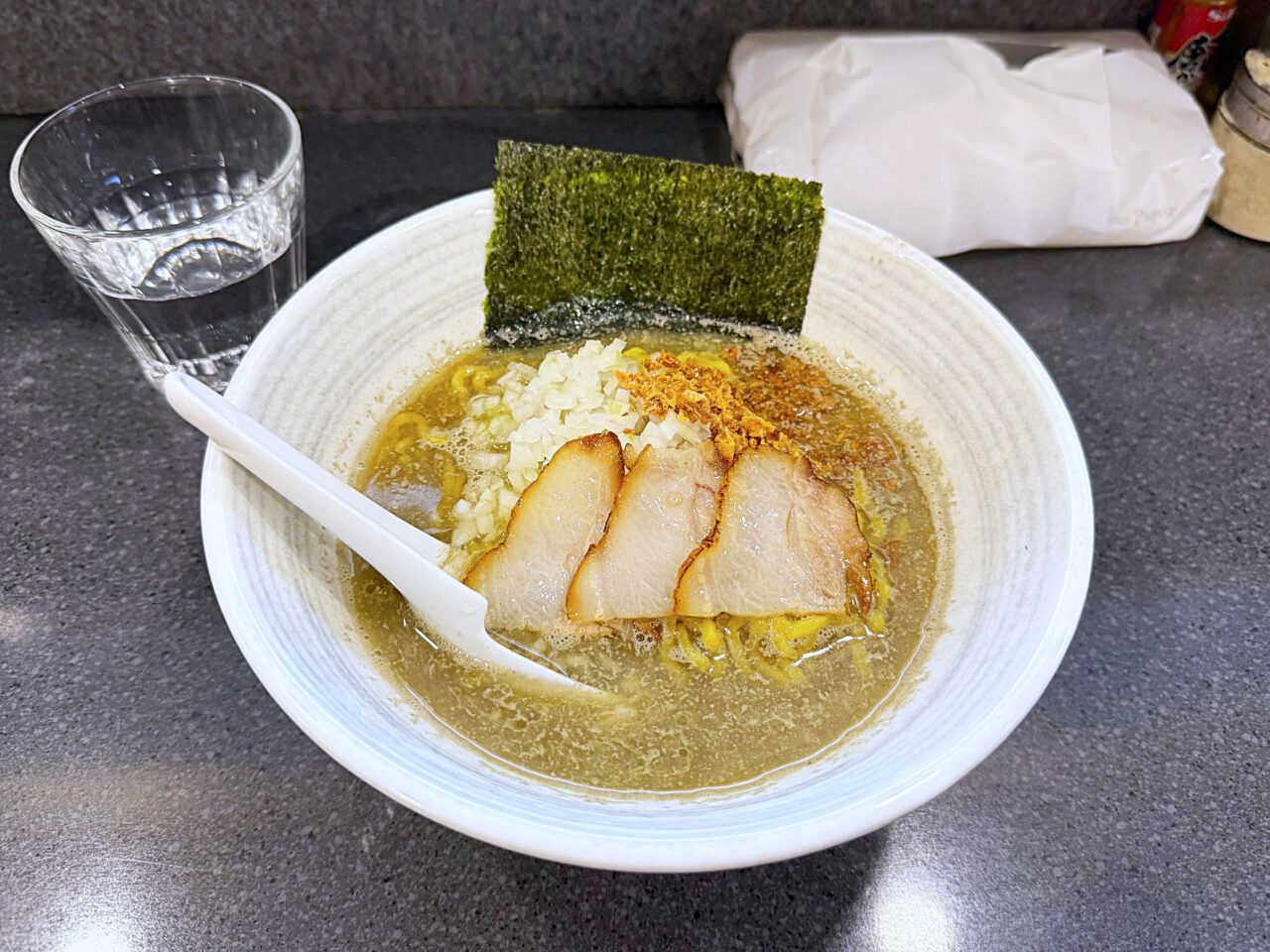 香ばしくスモークされた豚バラチャーシューや海苔、フライドと刻みの二種の玉ねぎもスープにとても良く合います。