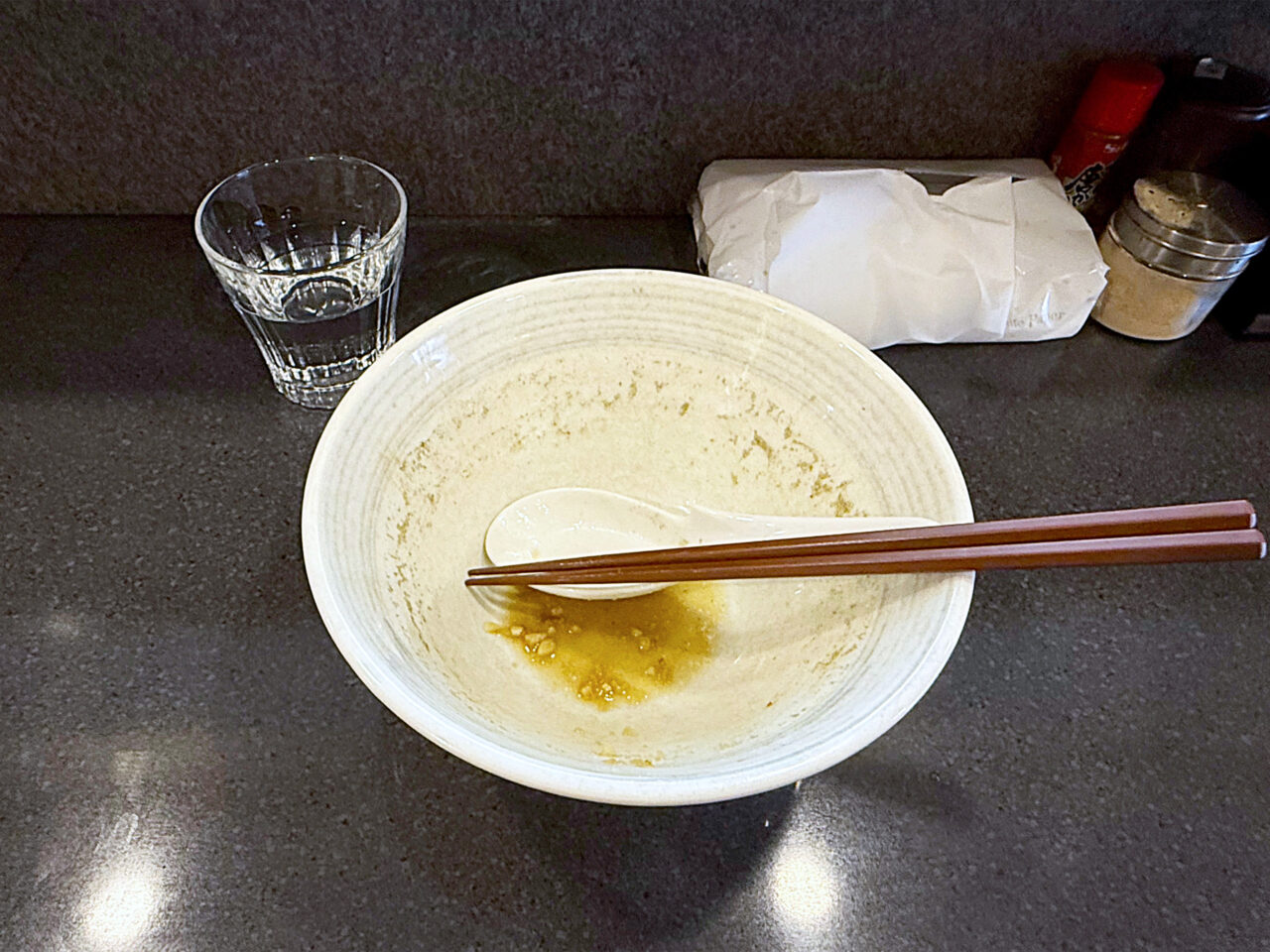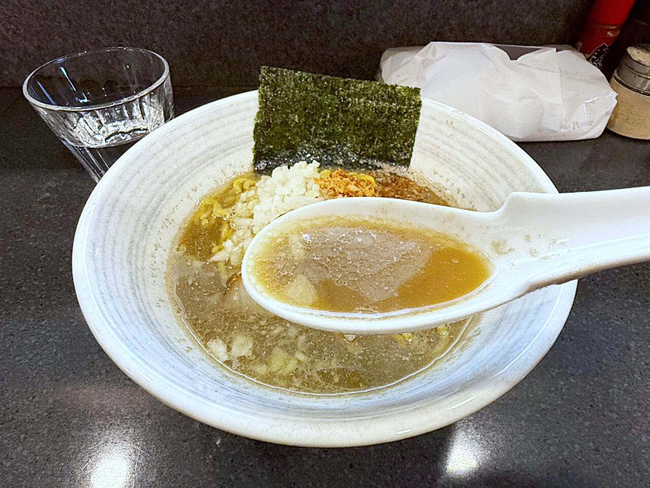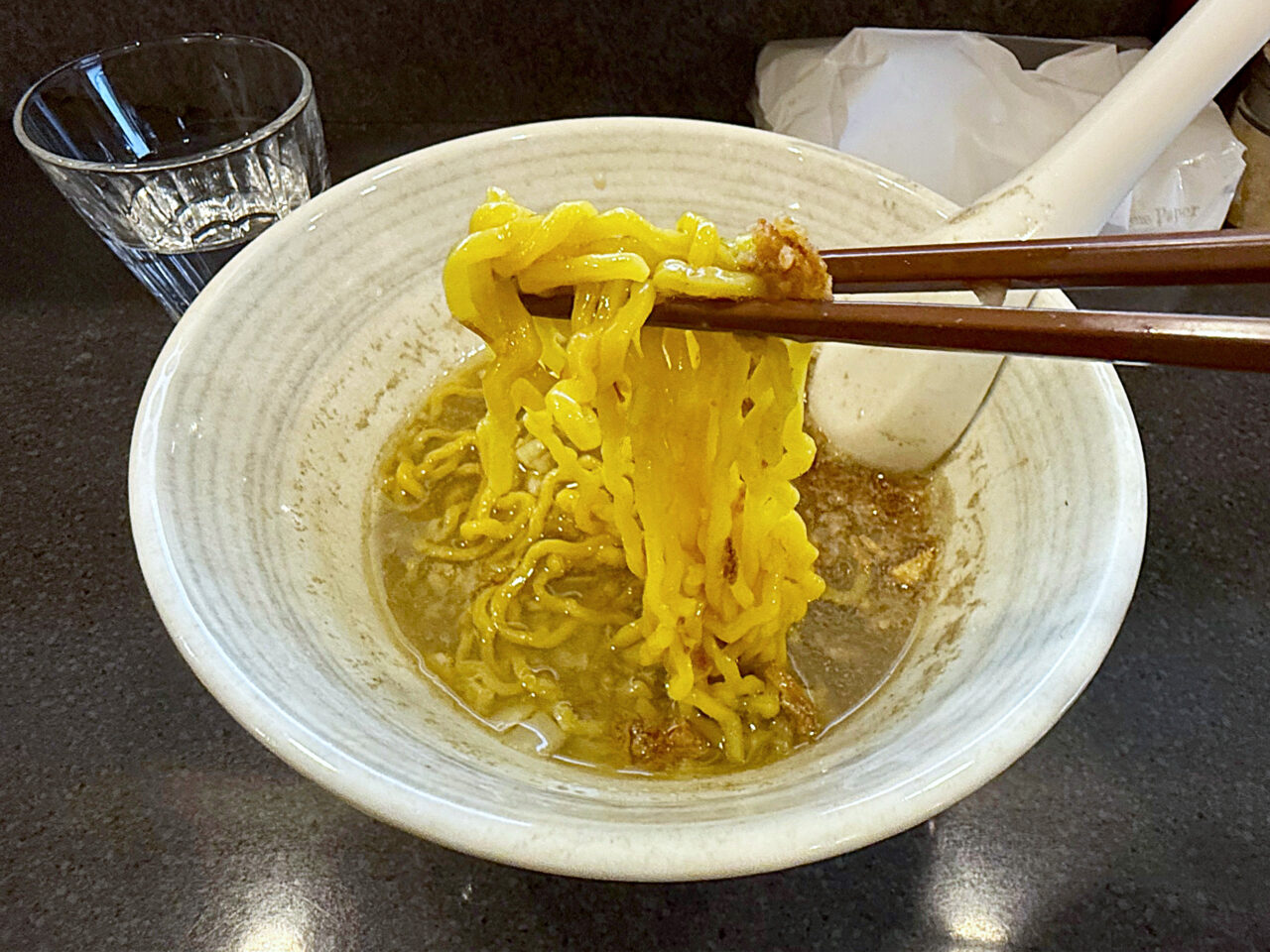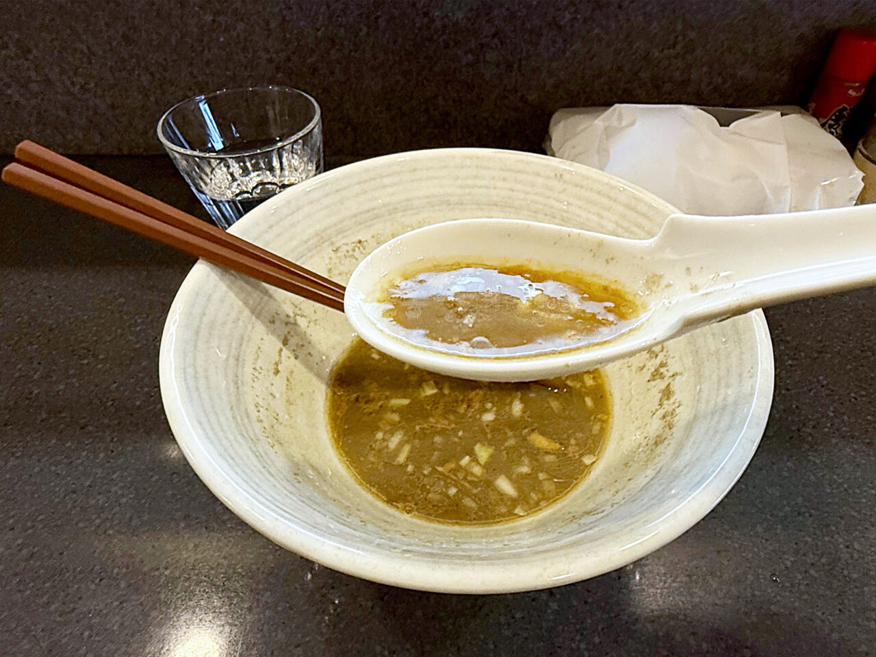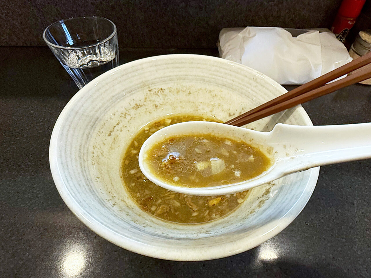 麺と具を食べ終えて、スープを味わいます。