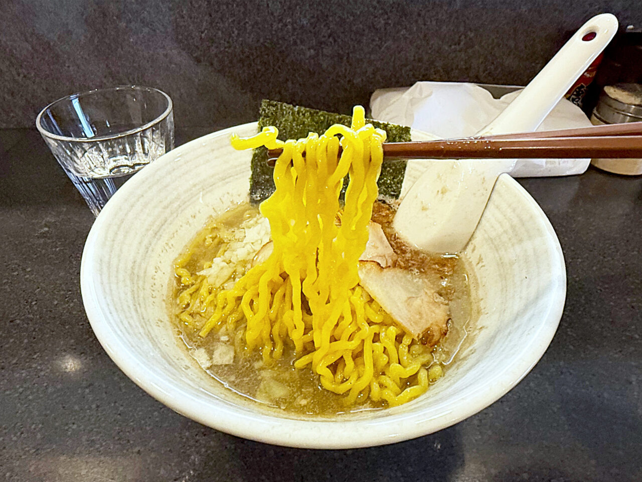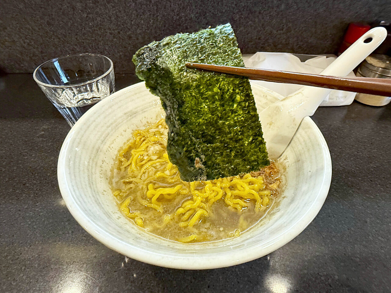 スープをたっぷり吸った海苔で麺を包むと、香ばしい海苔の風味と煮干しの味に、モッチリ食感の麺がとても美味しいです。