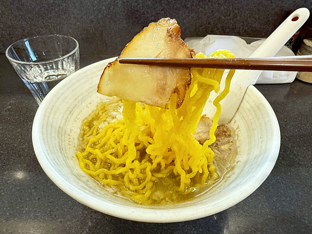 豚バラスモークチャーシューと麺をいただきます。