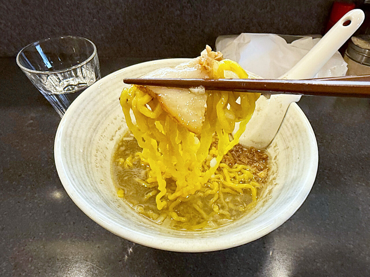 煮干し感ガッツリながら、セメント系の様な粘度までは無いサラサラなスープ。