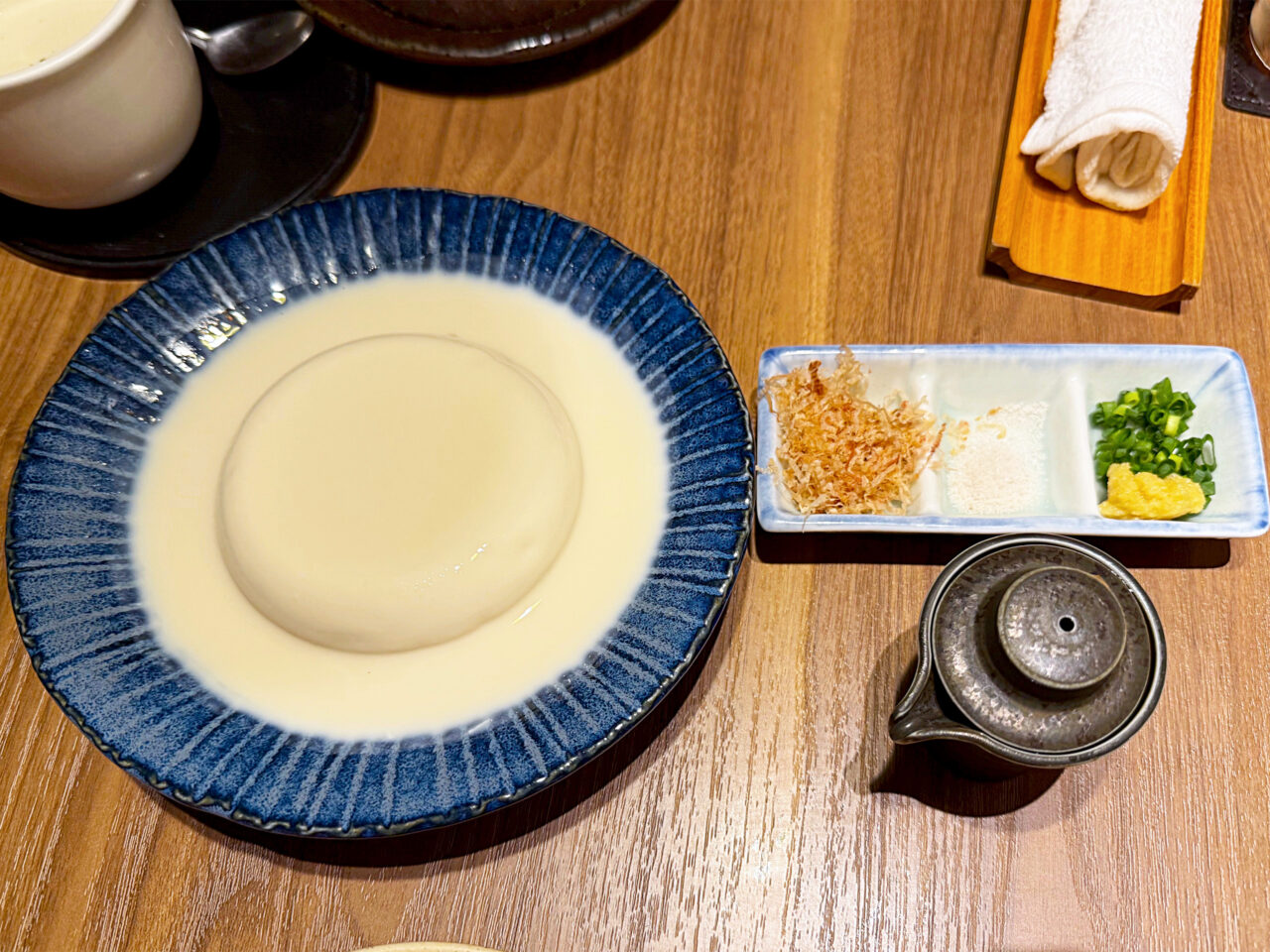 豆乳の中に豆腐が載っていて、出汁醤油を掛けて豆乳と共にいただきます。