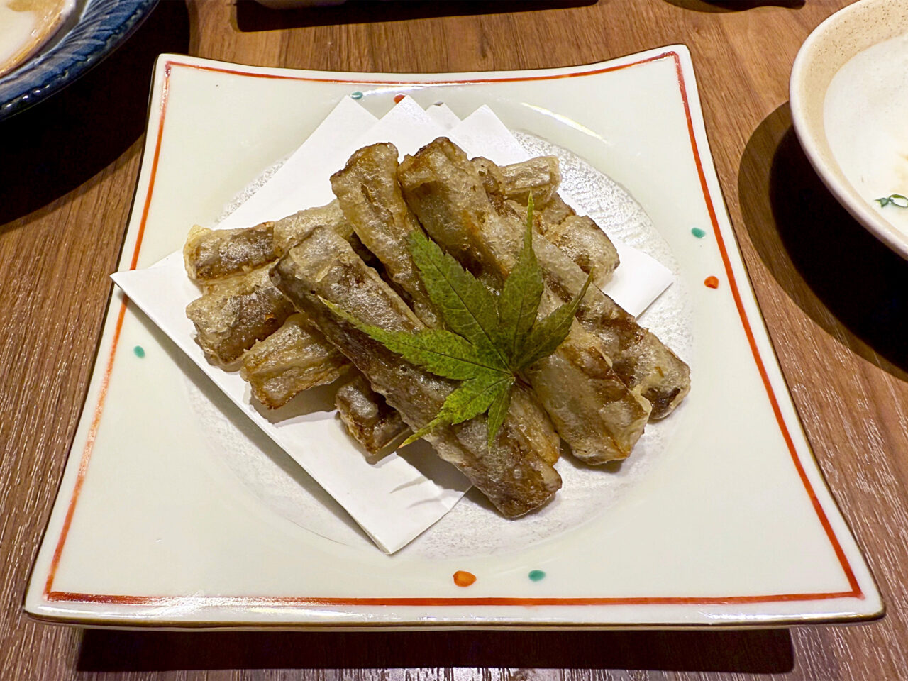 牛蒡をお出汁で煮込んでから揚げてあるので、ホクホク食感で美味しいです。