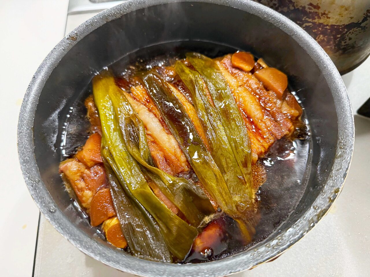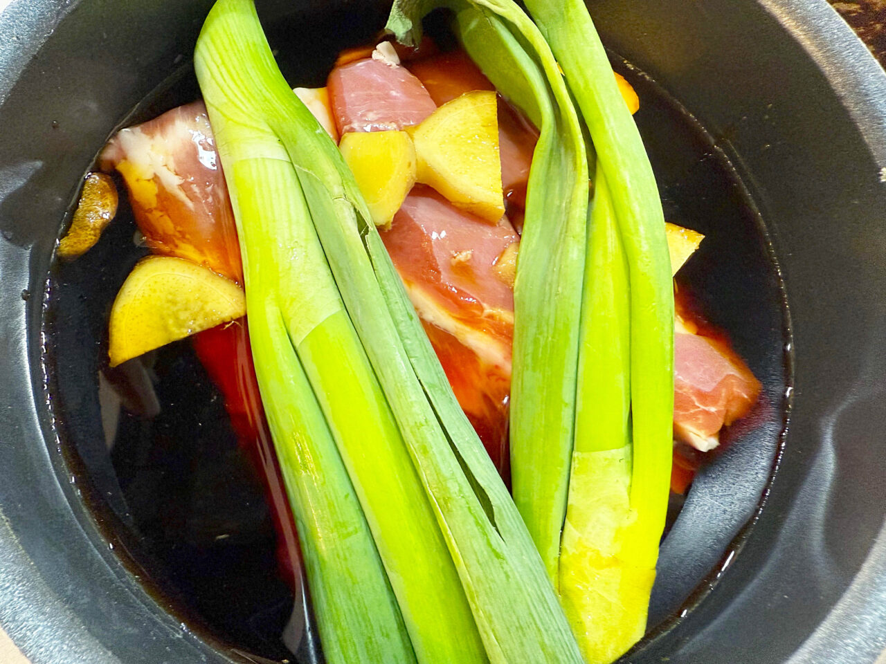 まずは豚バラをネギの青い部分や生姜を入れて、醤油と味醂で煮込んで行きます。