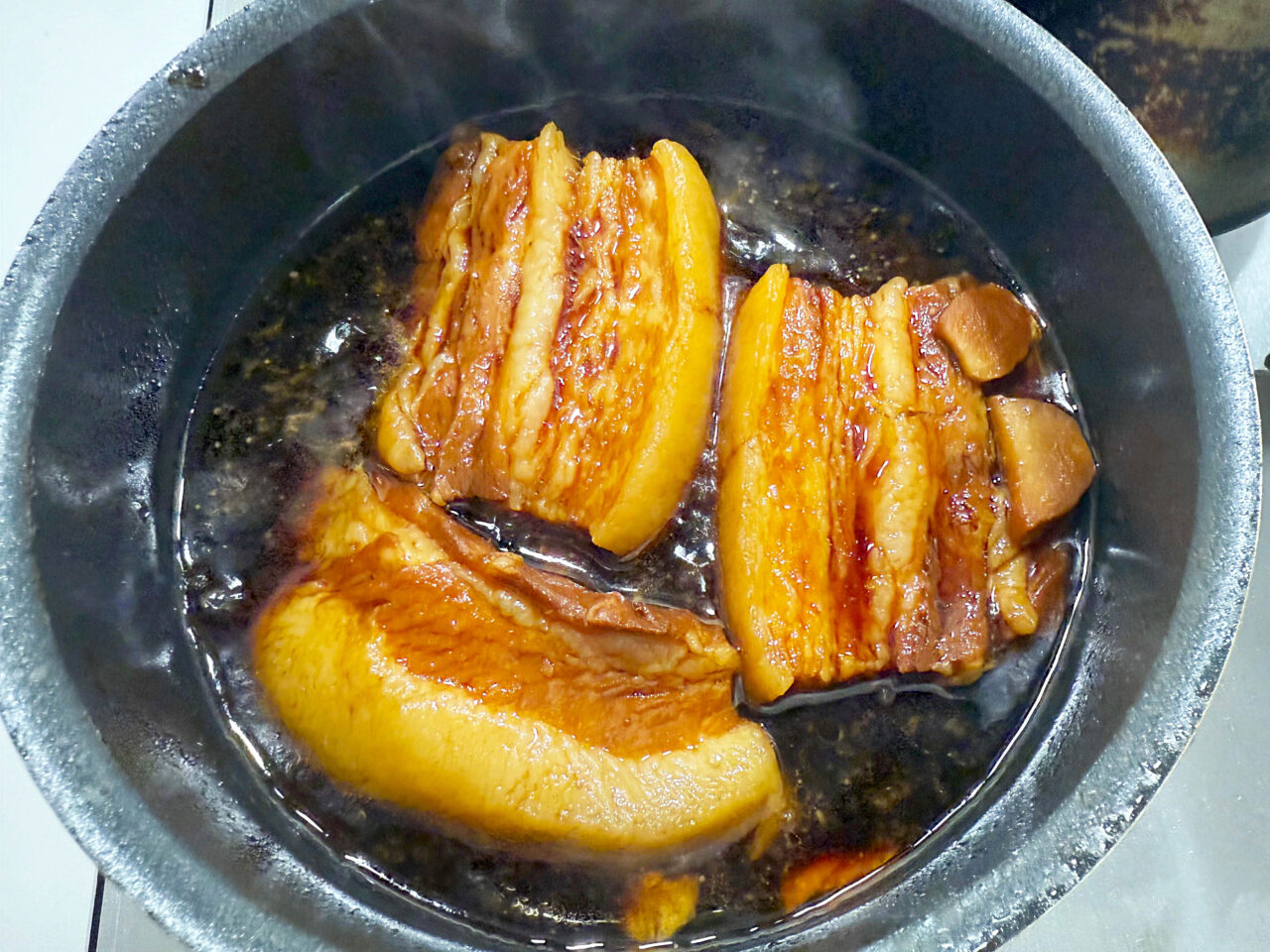 煮汁には豚バラの旨みと脂、そして生姜の風味が溶け込んでいます。
