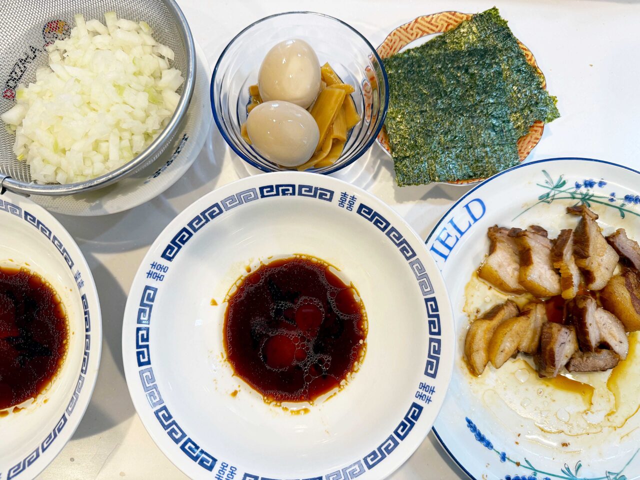 刻み玉ねぎやメンマ、事前に作っておいた味玉、海苔などのトッピング。