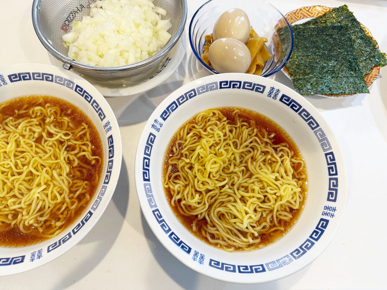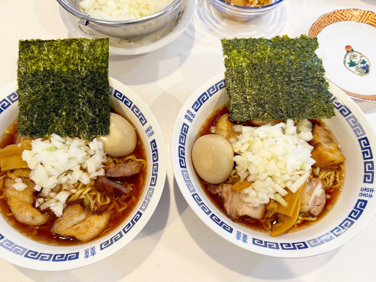 またトッピングも刻み玉ねぎや海苔、メンマを用意して本家「竹岡式ラーメン」に近付ける方向にしました。