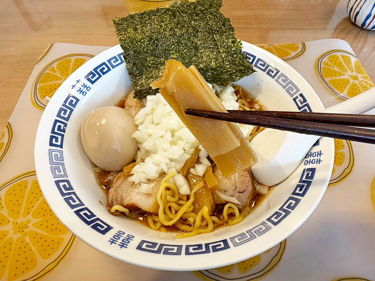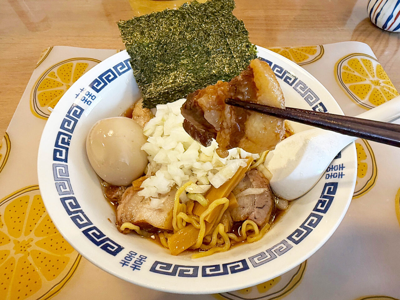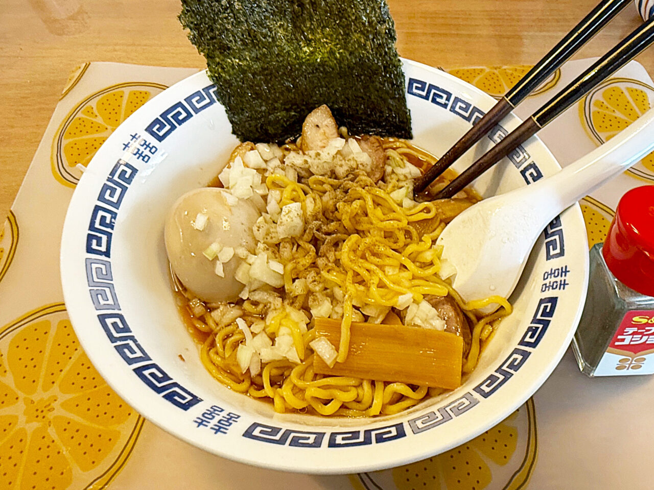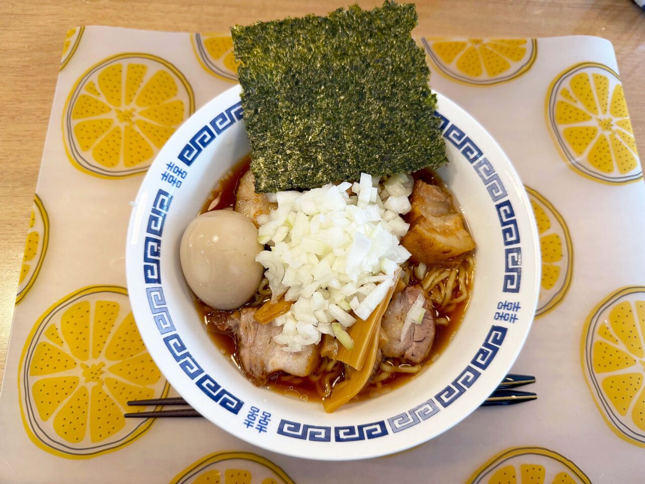 チャーシューや刻み玉ねぎ、メンマ、海苔、味玉などをトッピングして完成です。