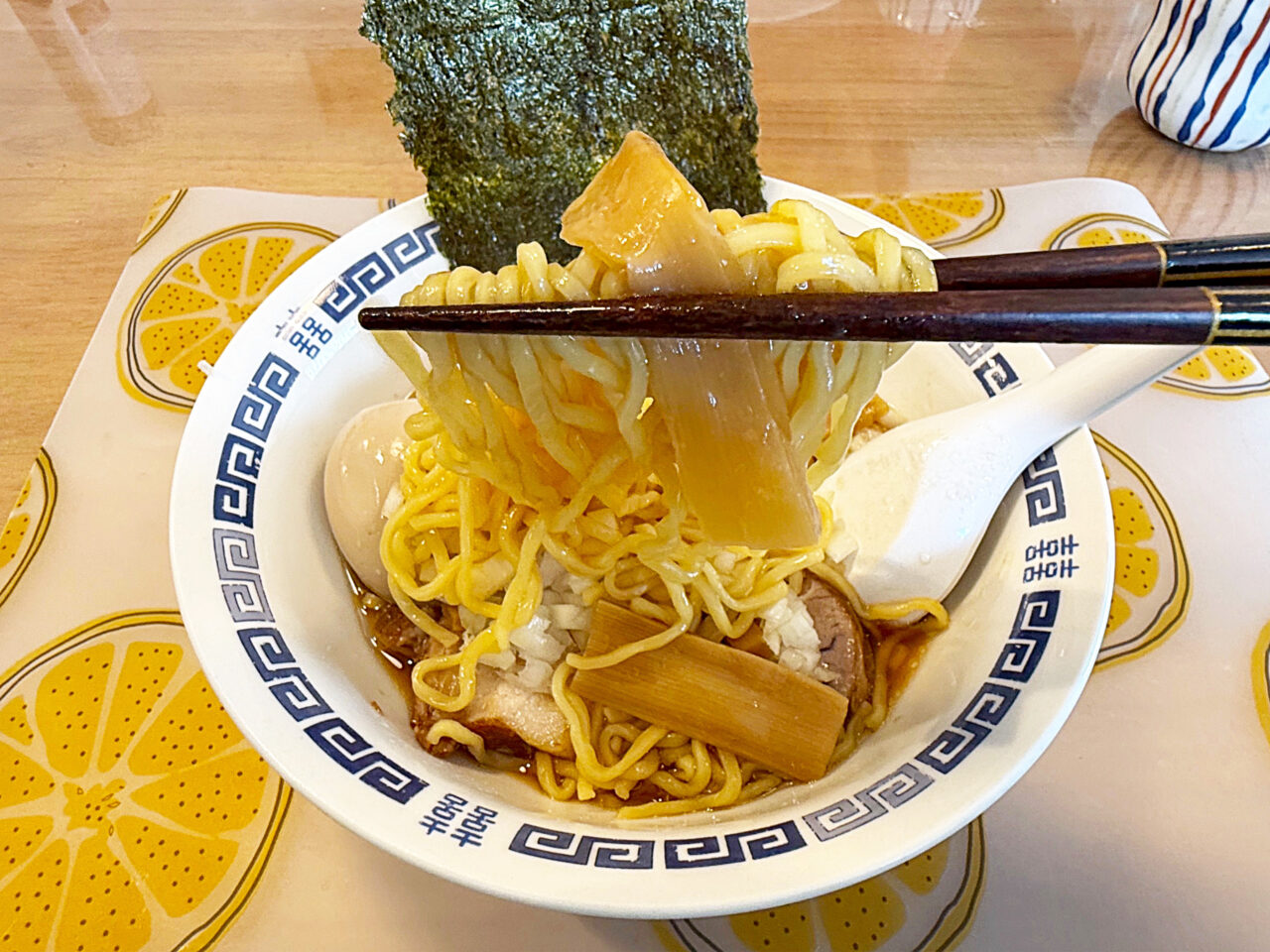 ガツンと醤油と生姜の効いたスープに、メンマの優しい味が良いアクセントになります。