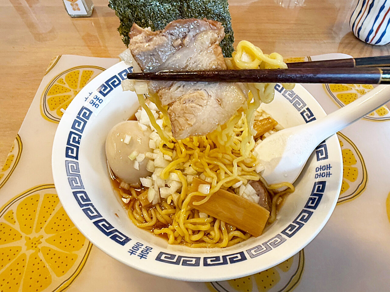 「竹岡式ラーメン」には豚バラチャーシューを沢山載せて、たっぷりの刻み玉ねぎを載せると美味しいです。