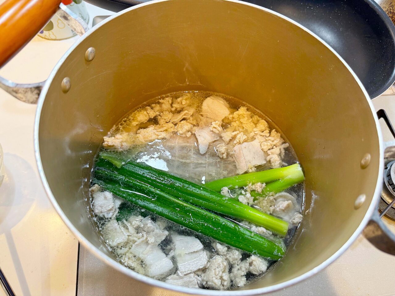 チャーシュー用の豚肩ロース、豚バラ薄切り肉、鶏挽肉、香味野菜などを入れて煮込みます。