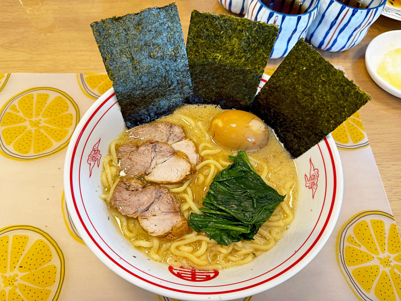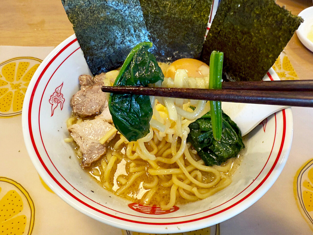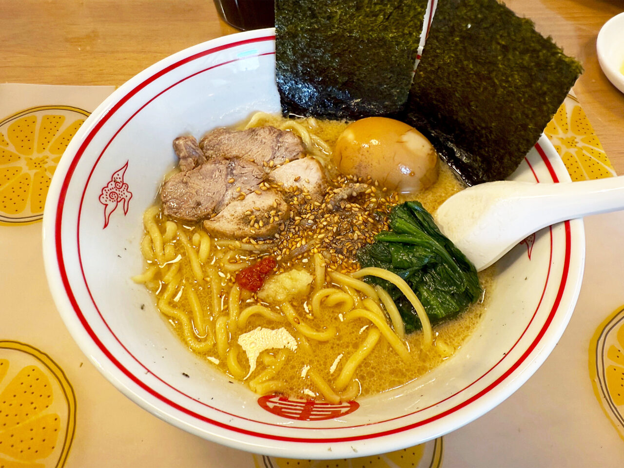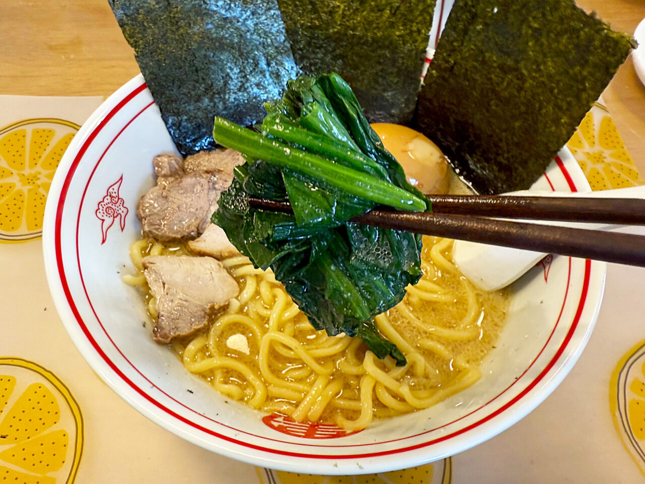 大きめの海苔を3枚載せると、アノ「豚骨醬油ラーメン」っぽくなります。