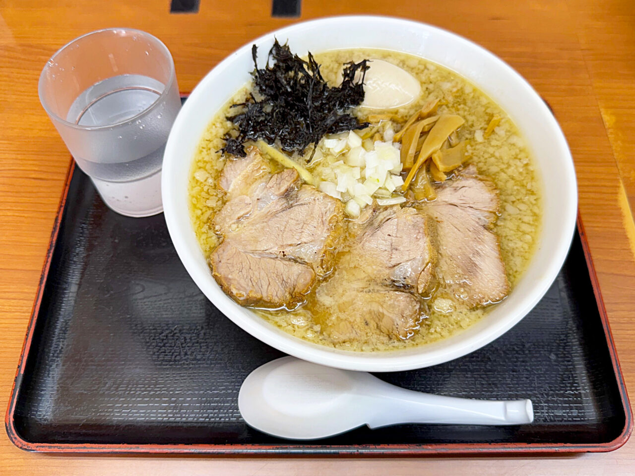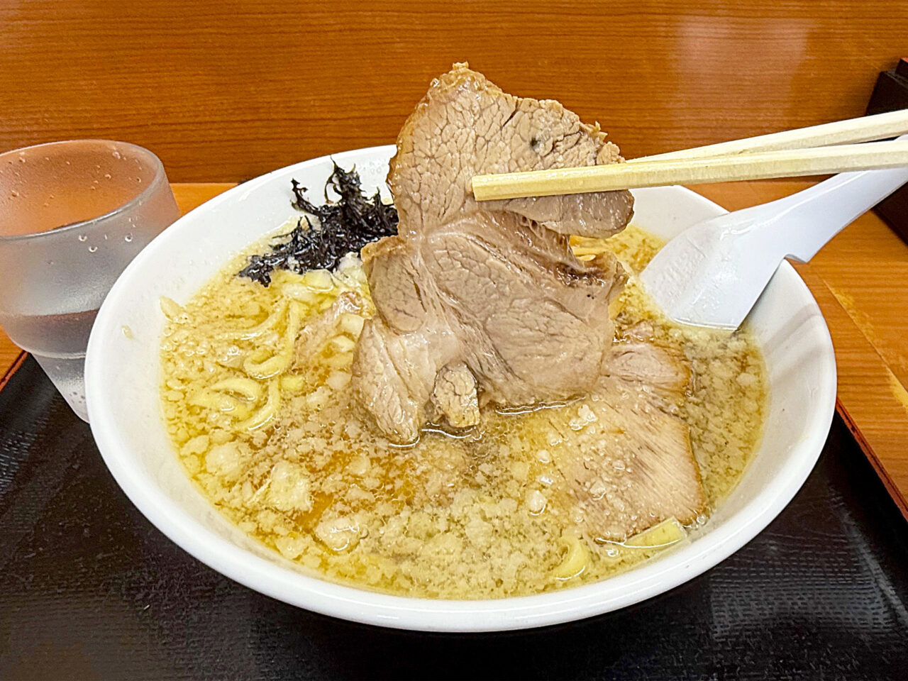 豚腕肉のチャーシューも味もボリュームも満足度が高く、細めのメンマ、刻み玉ねぎ、バラ海苔もスープに良く合っていて美味しいです。