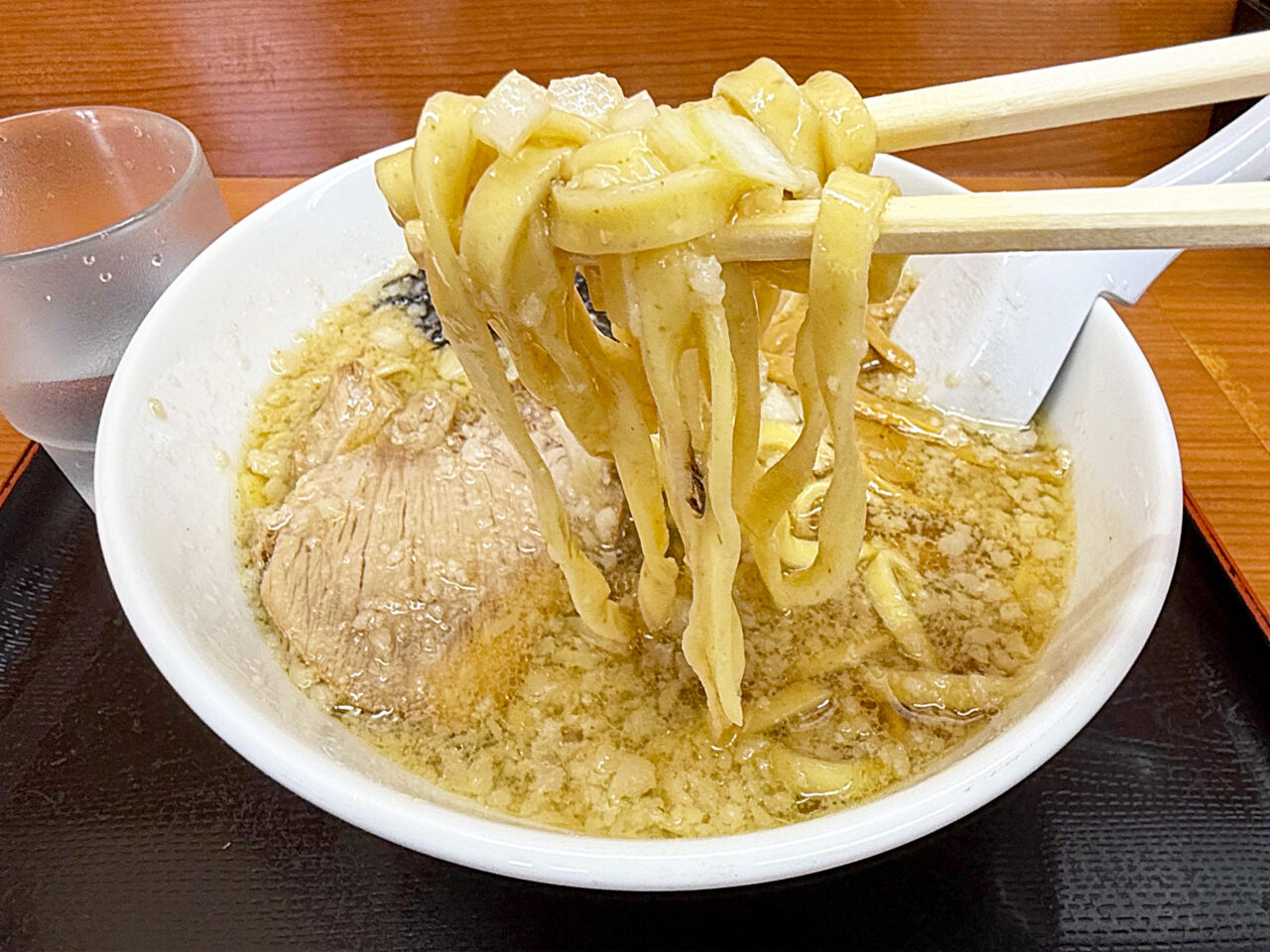 背脂が浮いたスープは豚と魚介の旨みで、クドさは無く背脂で甘味とまろやかさを加えています。
