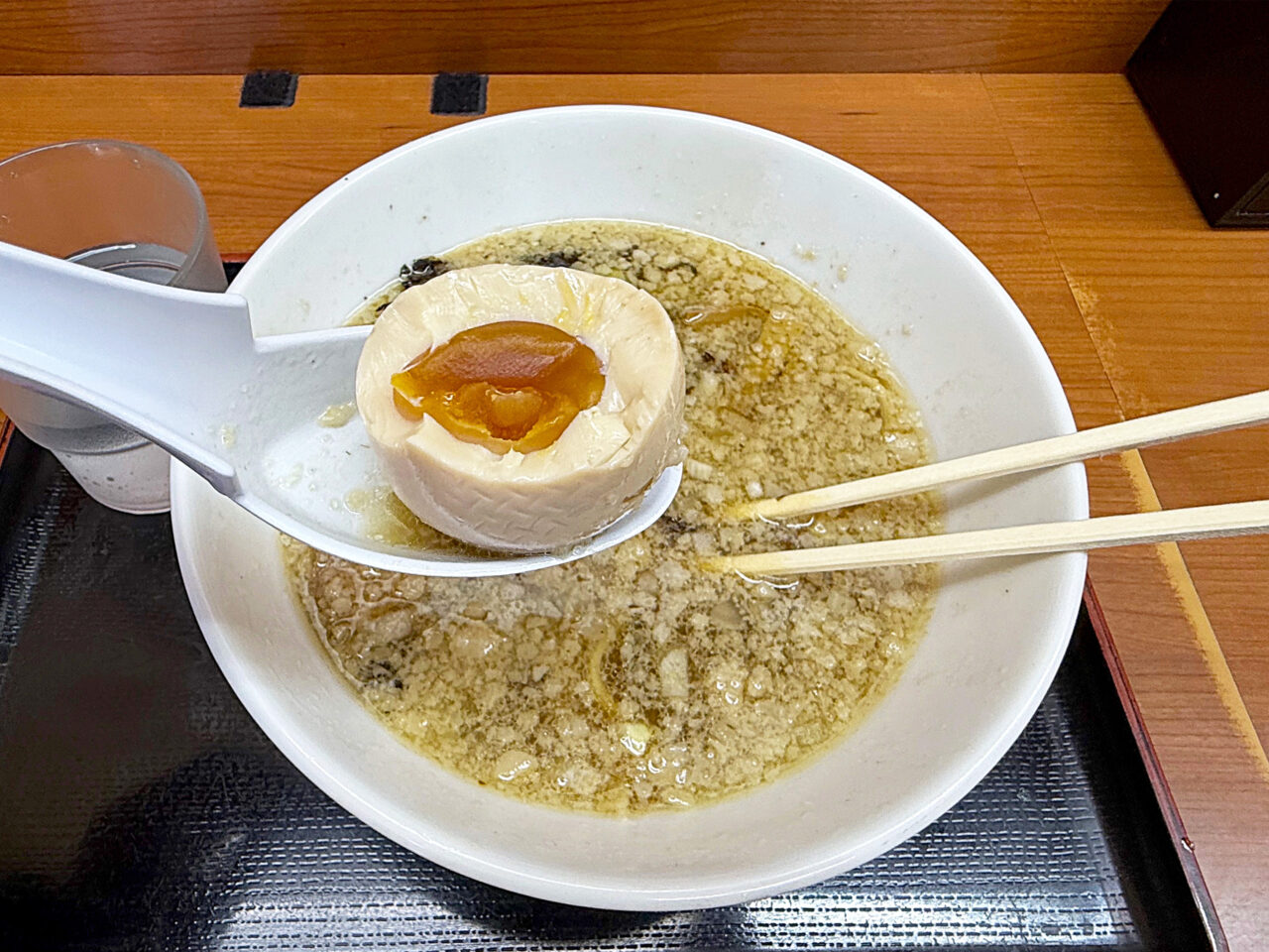 豚と魚介のスープは、カエシにも魚介を加え、醤油と塩で絶妙に調整してあって、背脂の甘味とまろやかさでとても美味しいスープです