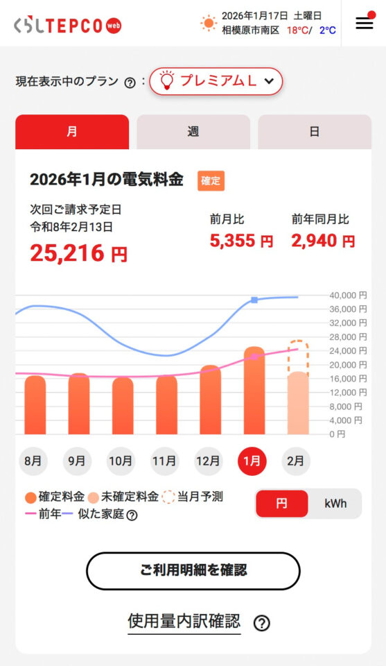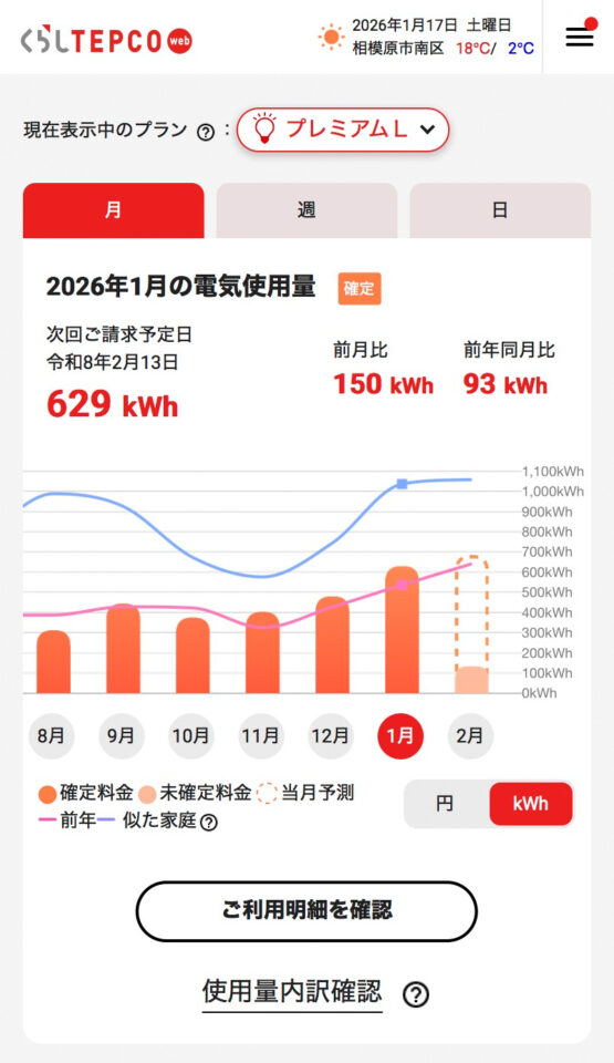 2025年12月〜2026年1月も、かなり強烈な寒波が有り、床暖房に加えてエアコンの暖房も点け始めた事で+150kWhで+¥5,355になったものと思われます。