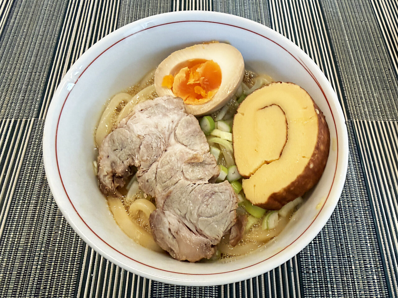 その醤油ダレやチャーシュー、味玉を使って、「釜玉うどん」を作ってみました。