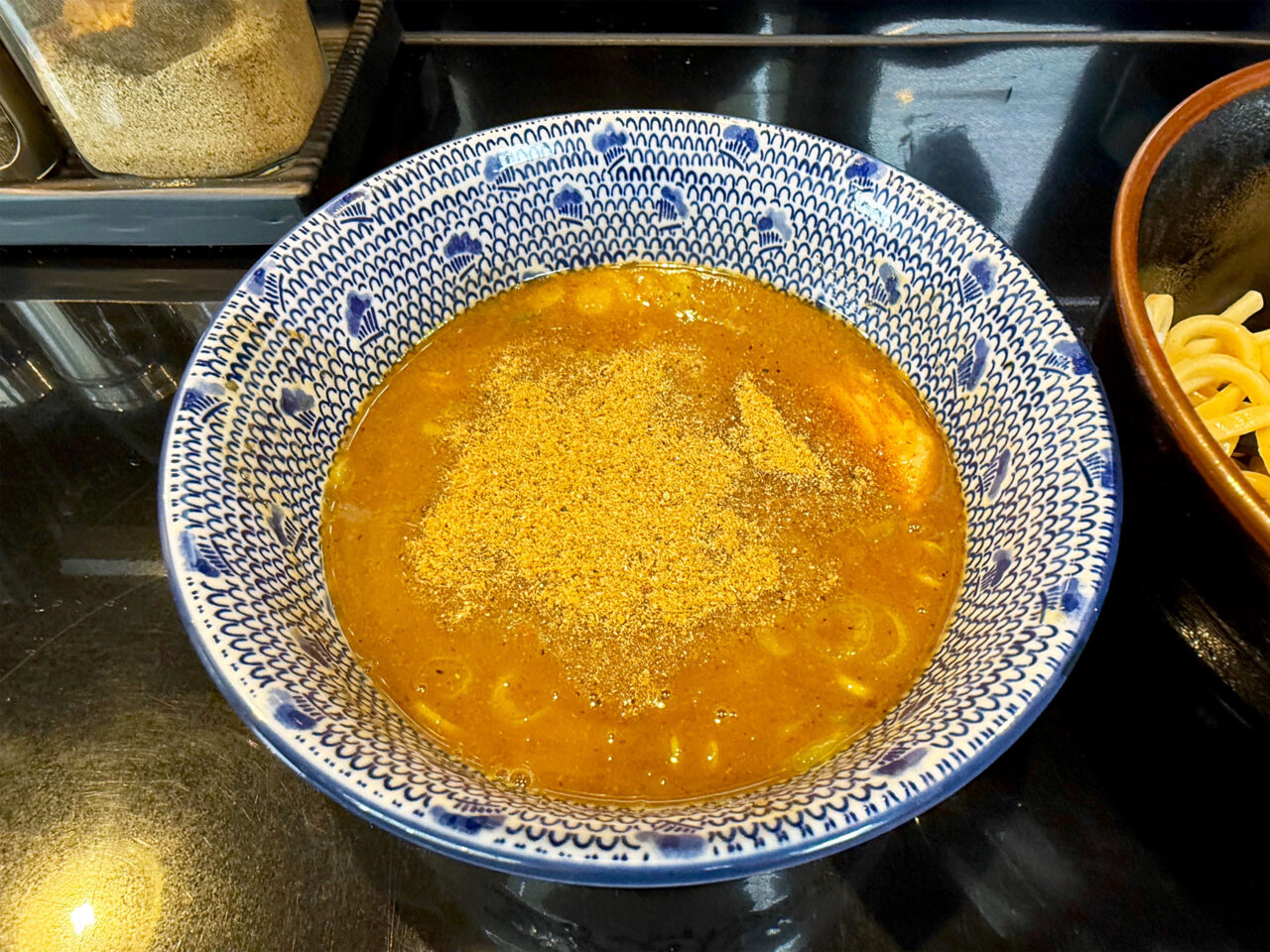 濃厚魚介系つけ麺のスープに魚粉を加えると、魚介感が増して麺の水分で薄まった味が戻ります。