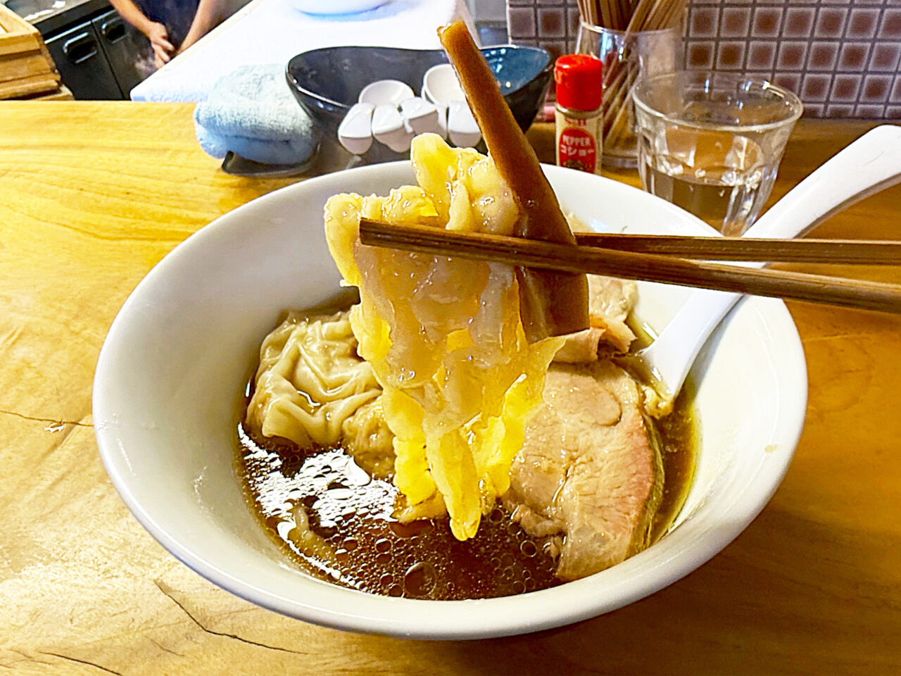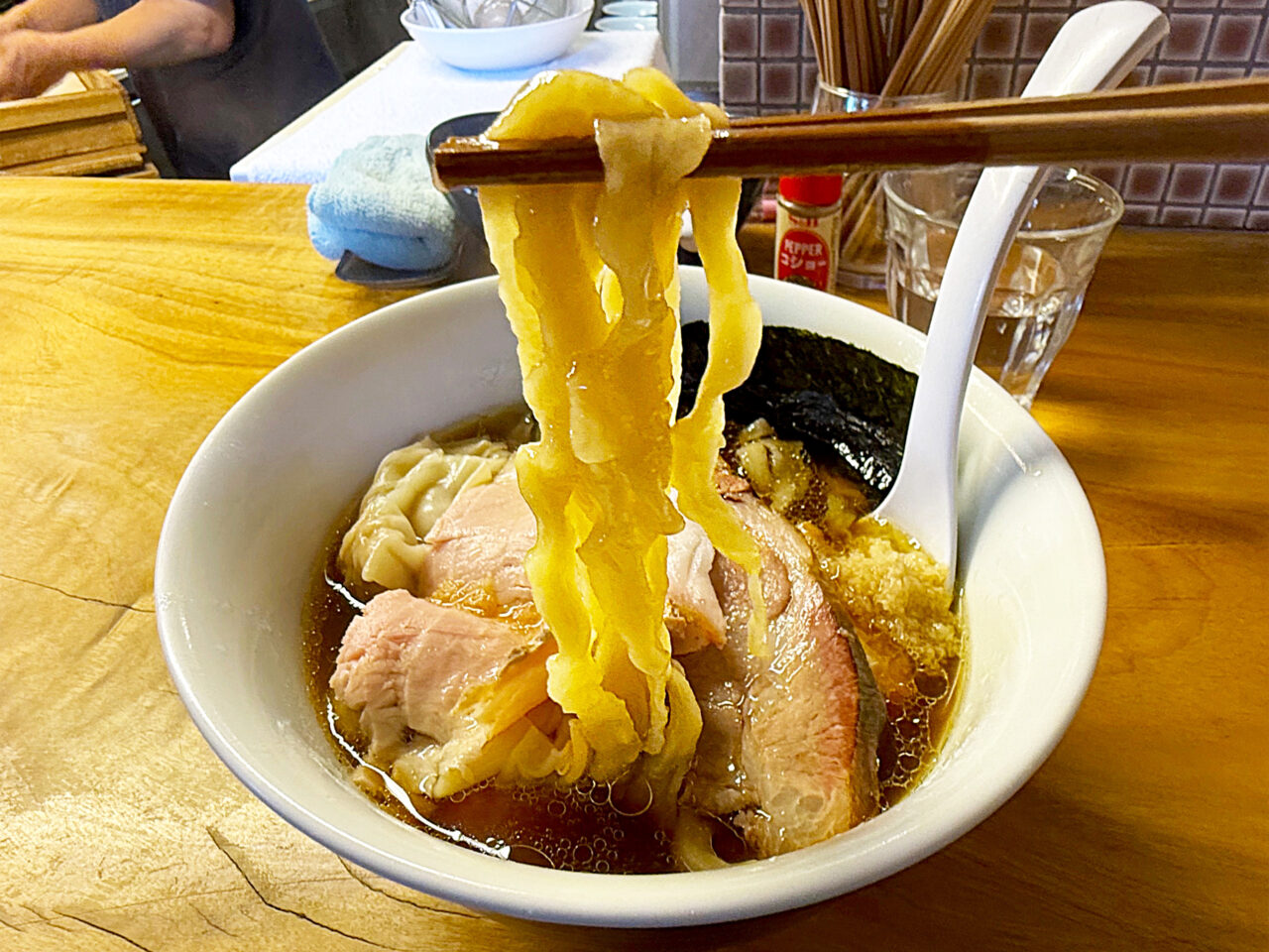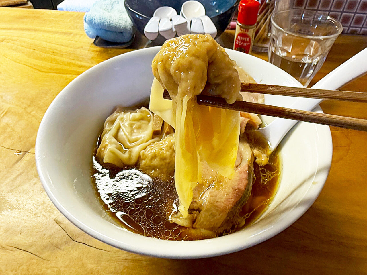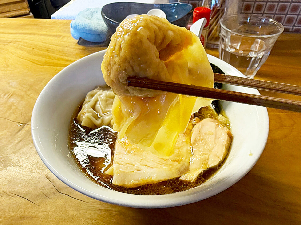 キレのある醤油味スープに唯一無二の手打ち麺、美味いチャーシューにワンタンと、全方位にスキの無い素晴らしい一杯です。