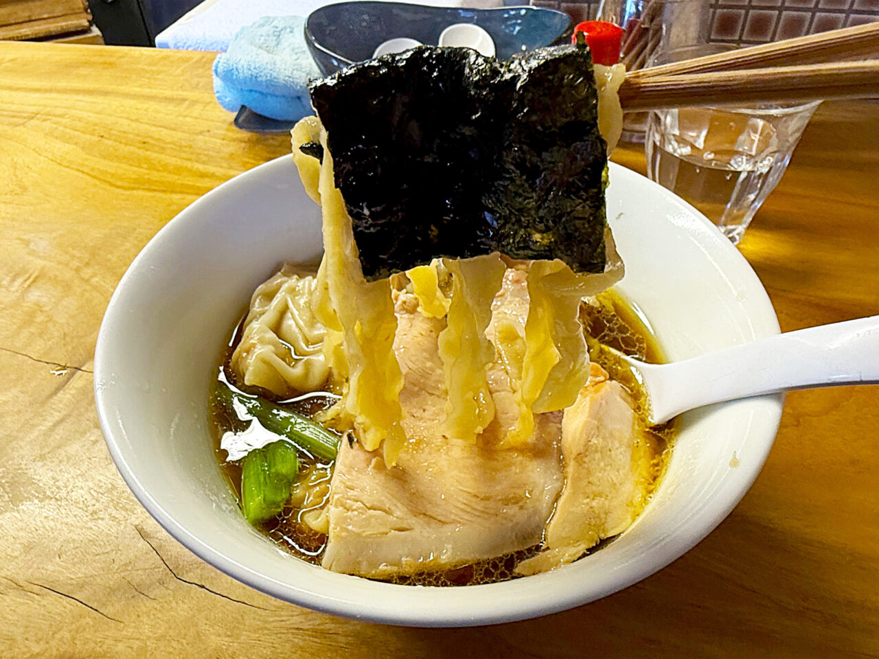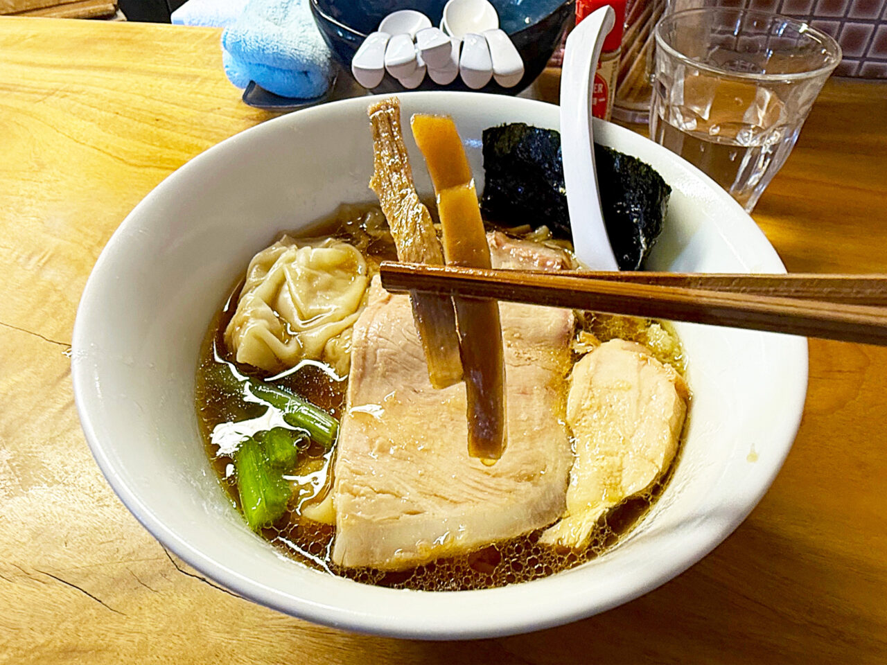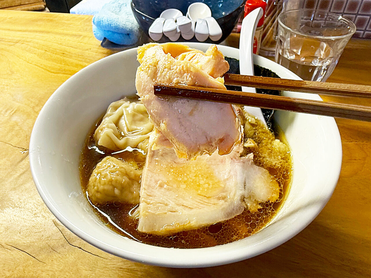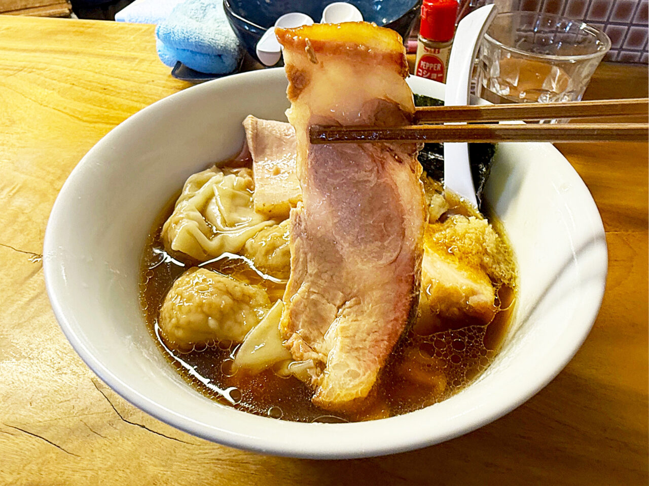 キレのある醤油味スープに唯一無二の手打ち麺、美味いチャーシューにワンタンと、全方位にスキの無い素晴らしい一杯です。
