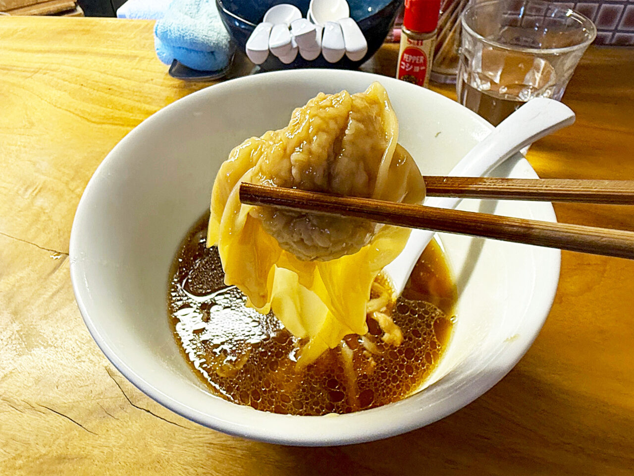 ワンタンは後半になると皮にスープが浸みて来ます。