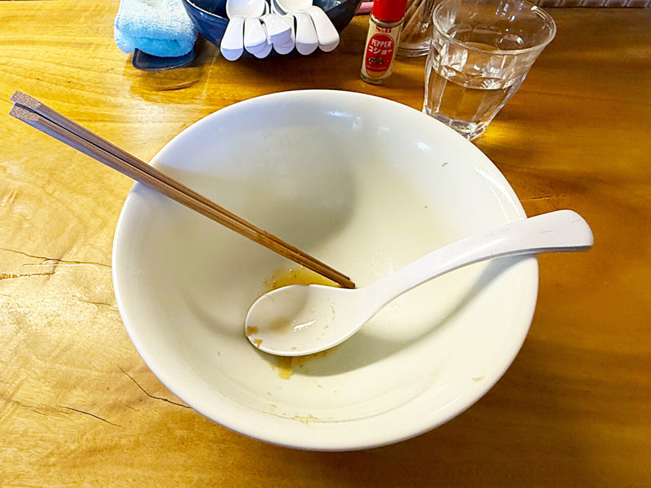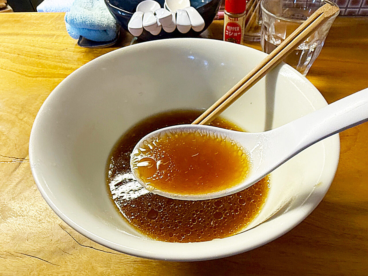 麺と具を食べ終えて、スープを味わいます。